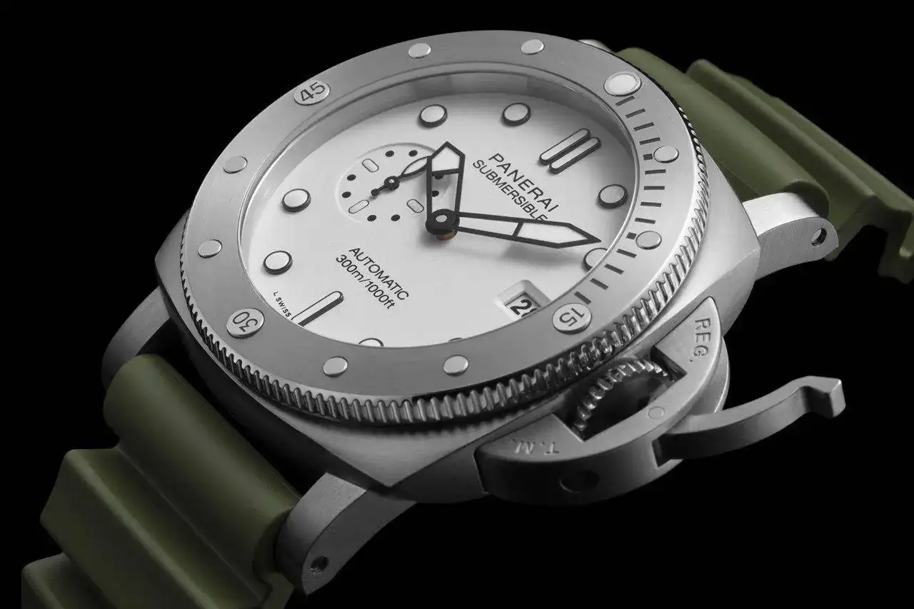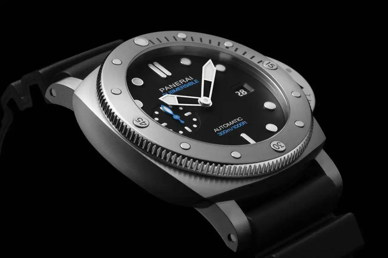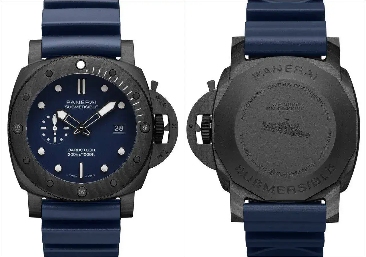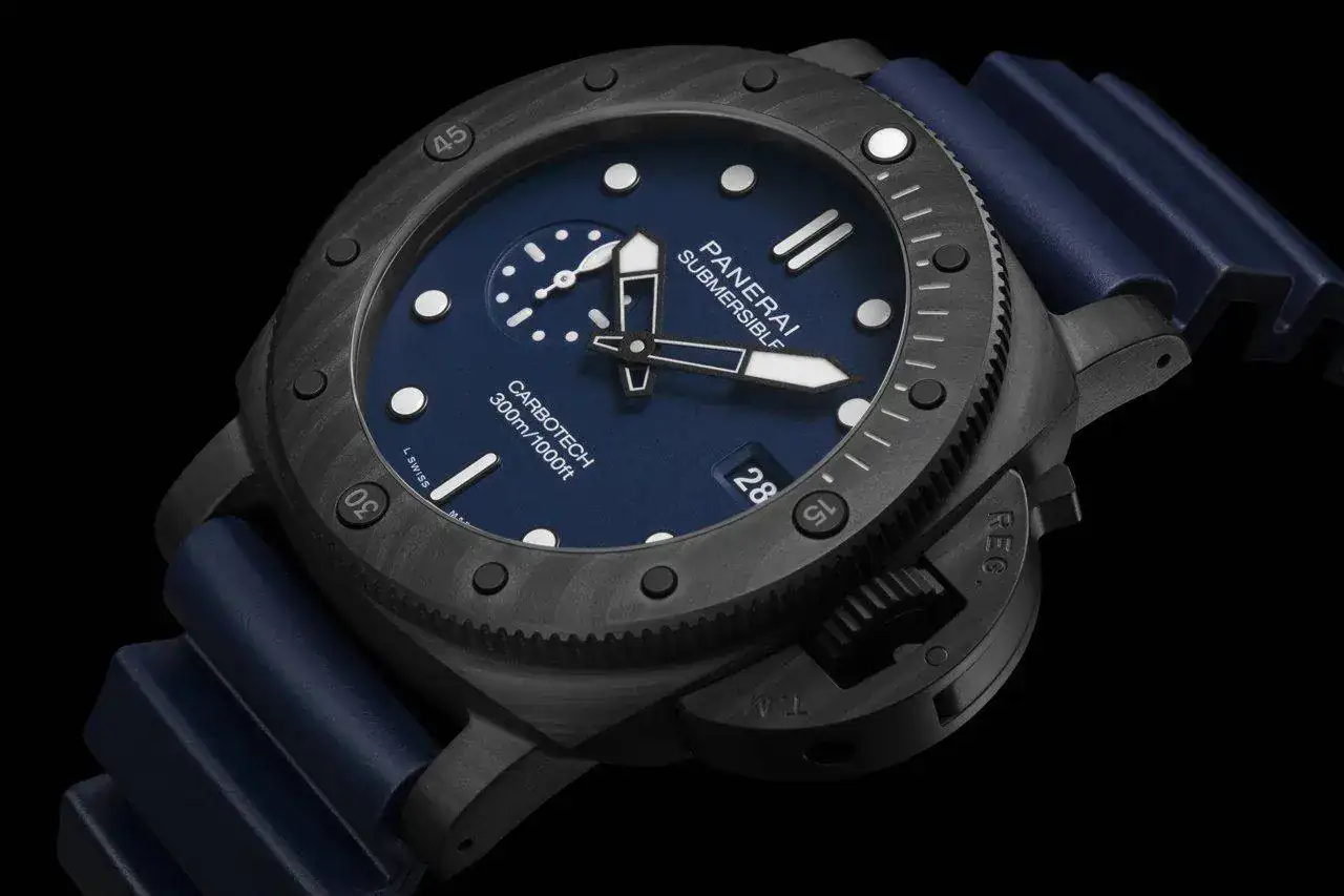 El Submersible QuarantaQuattro Carbotech™ Blu Abisso (PAM01232) presenta una caja hecha de Carbotech, un compuesto a base de fibra de carbono que reúne características y propiedades específicas: más ligero que el titanio, alta resistencia a la corrosión, al rayado y a los golpes. Es precisamente la disposición aleatoria de las fibras la que hace que no haya dos cajas iguales. La corona es de titanio tratado con DLC de un tono similar. La esfera y la correa de caucho son de color azul profundo.