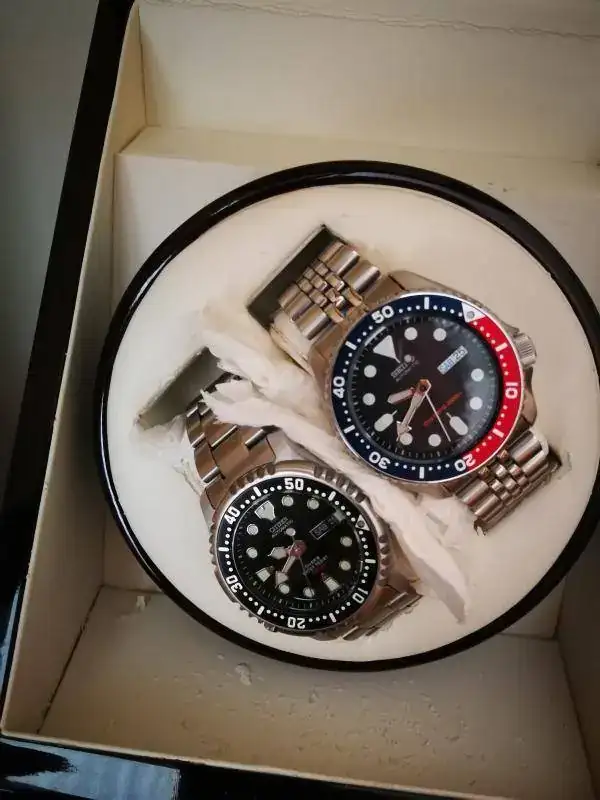 Y por cierto, ambos muy ligeros, ambos de tamaño contenido, creo que 40/41mm. El Citizen muy superior en cuanto al armis, con extensión de buceo.