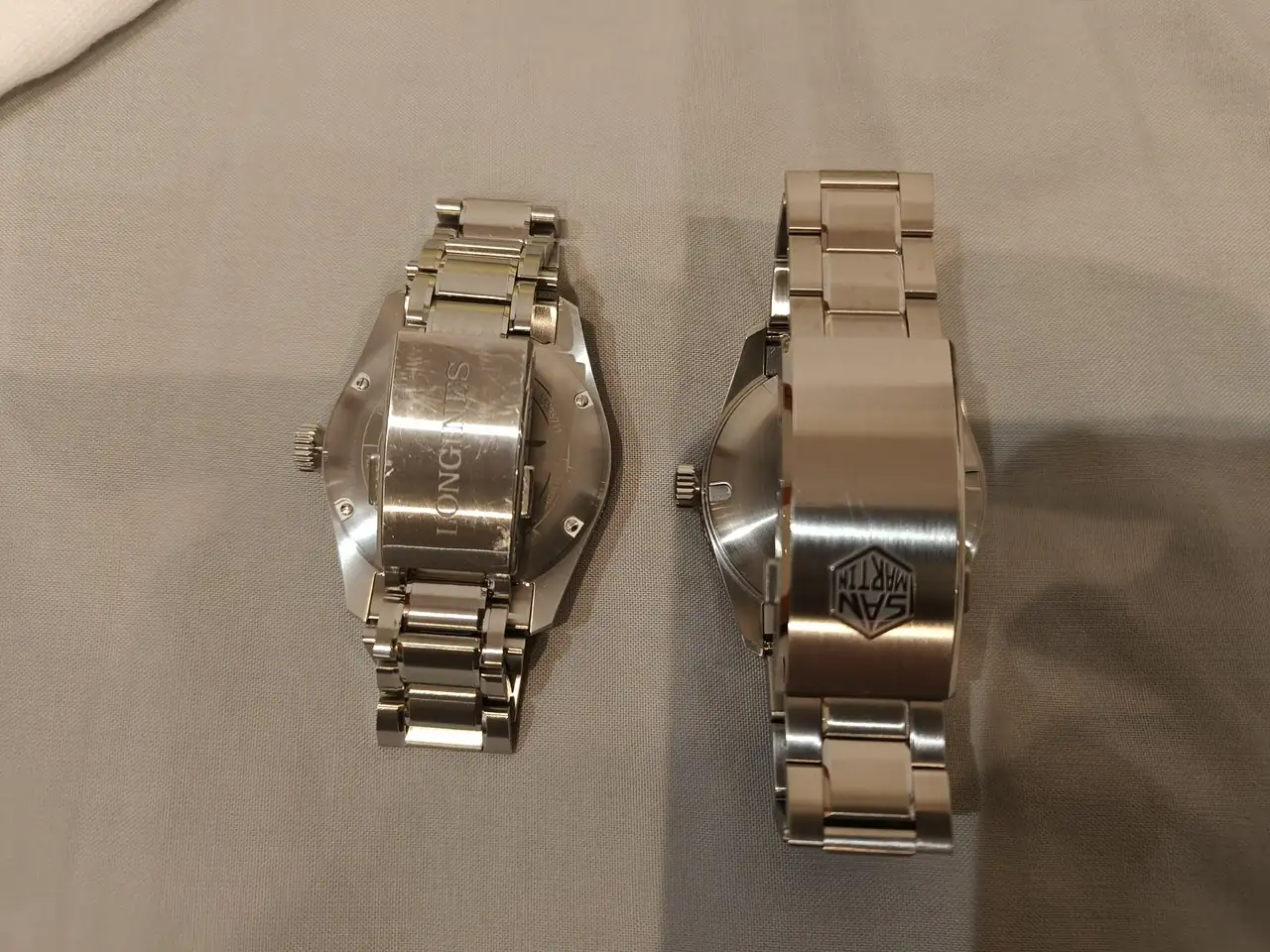 Siendo la estanqueidad del Longines de 100 metros, contra los muy respetables 200 metros de su homenaje. Y la del Longines esta grabada, cuando la del San Martin es lisa sin ningún tipo de grabado.