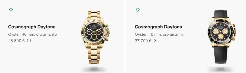 - Rolex Daytona oro 18k: Peso version Brazalete:210gr/Correa:160gr. Diferencia de precio 11.100€, diferencia de peso: 50gr. Relacion: 222€/gr. Comentarios: el OysterFlex cuenta con Glidelock, de ahi su menor diferencia en peso.
