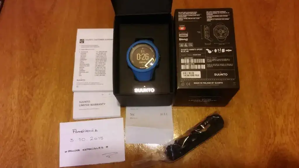 Fue comprado en una tienda de Madrid en Junio de este año, por lo que tiene garantía vigente hasta el 2017 de ese mes. Por supuesto tiene el ticket de compra y viene con toda su dotación completa: caja, papeles, cargador y correa+sensor.