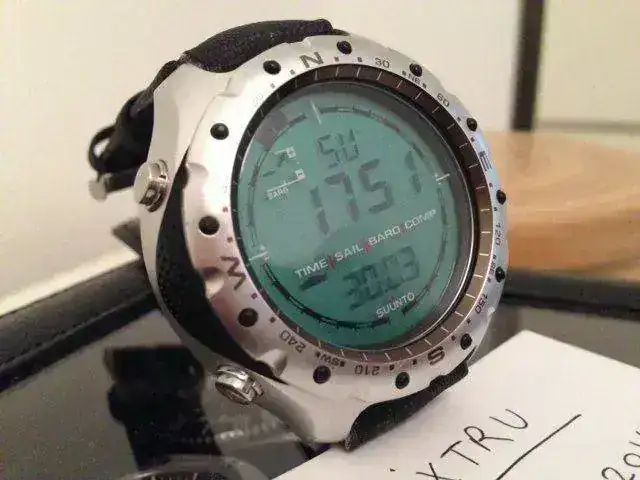 Tiene timer para regatas, barómetro, brújula ... y una bonita carcasa metálica que lo hace muy resistente a los golpes y elegante, además de una correa de tela de barco.