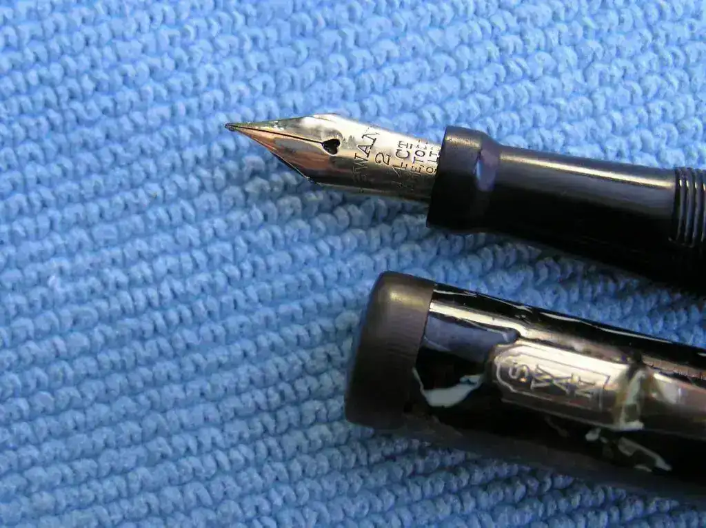 El material parece celuloide pero creo que es plástico. El plumín es de oro y lleva la inscripción Swan 2 14 CT Mabie Todd & Company Ltd.