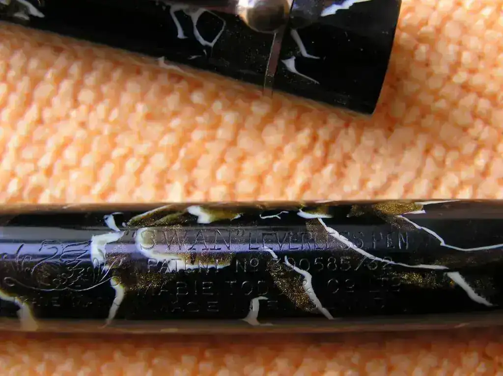 El cuerpo está profusamente grabado y se puede leer SWAN LEVERLESS PEN PAT NO 390585/32 MABIE TODD & CO. LTD. MADE IN ENGLAND además del dibujo de un cisne junto a las palabras TRADE MARK.