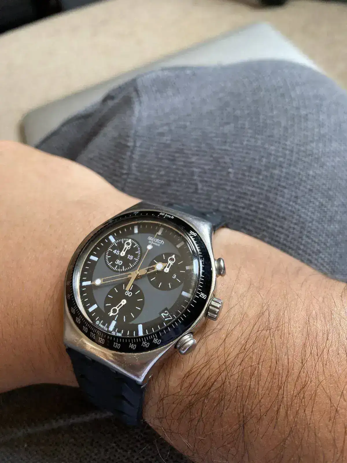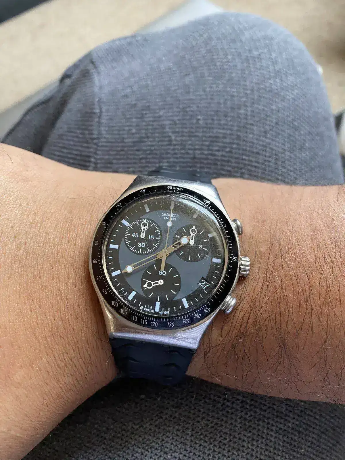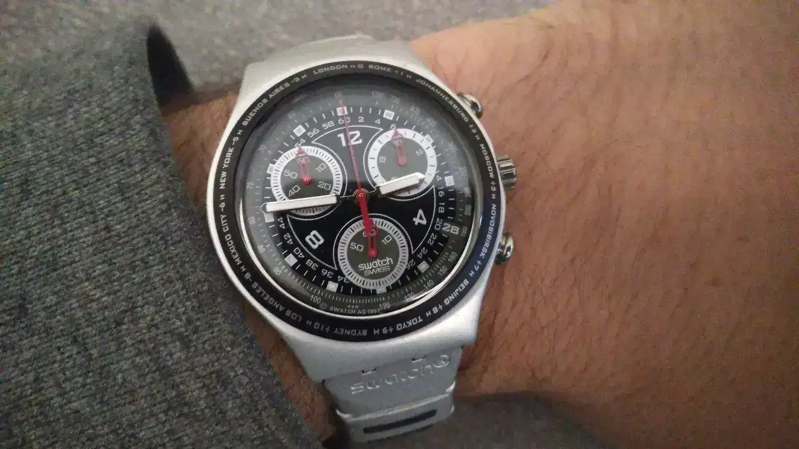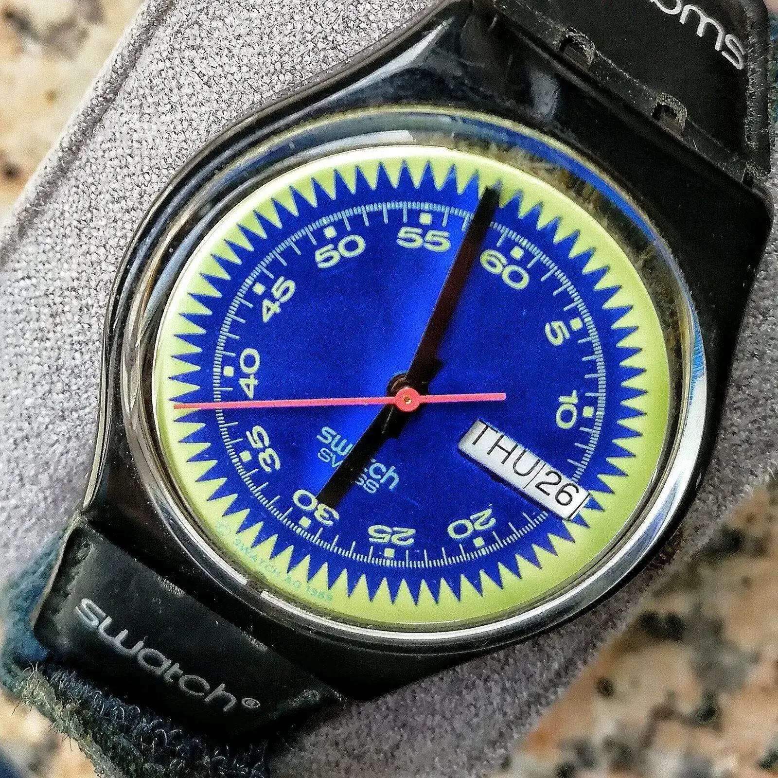 Hola! Pues os presento a uno de los míos...es de cuando tenía 12 años (tengo 43) y vino de Suiza. ..lo usaba todos los días... me he bañado en la piscina y en el mar con el...como era resistente al agua 30 metros había más que margen...la correa obviamente le murió varias veces...pero ahí lo tenéis: más de 30 años y aun se escucha en toda la habitación. Es de la colección de 1989.