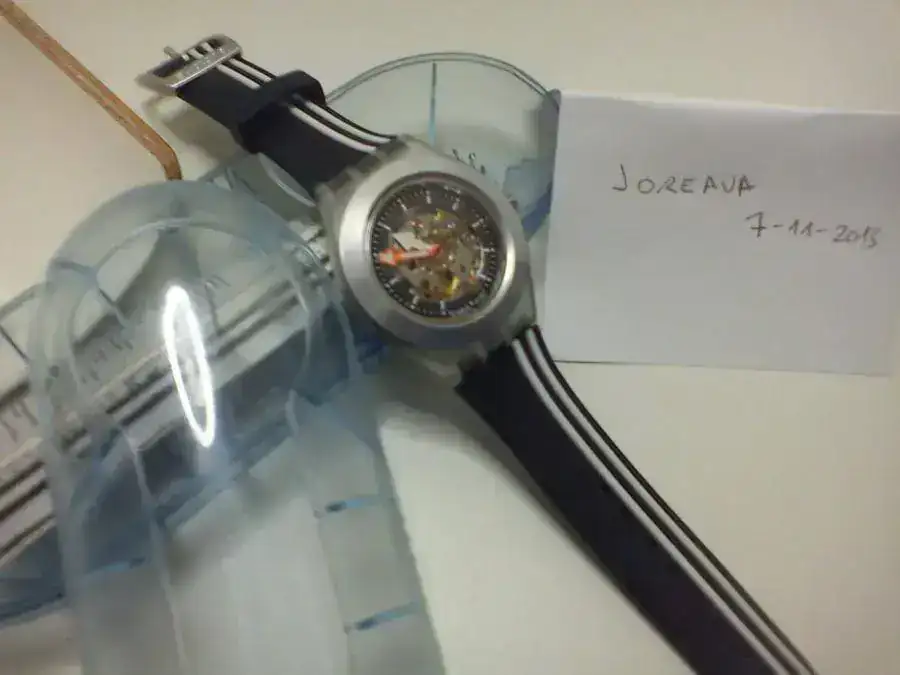 único por poseer las agujas del archiconocido Ecozilla, (42mm). El reloj es de 2001 pero se conserva muy bien. Me llego proviniente de un cambio y tras ponerle una correa swatch original (y nueva), que le queda muy bien, lo saco a ver si consigo una pieza un poco más todotorreno para el día a día en el trabajo. Por cierto, incluye también su caja, y la documentación.Su estado es muy bueno, algún pelillo en el bisel que es de aluminio pero que practicamente no se vé. La hermeticidad del mismo no está comprobada, ya que a mi me vino con las agujas ya cambiadas.