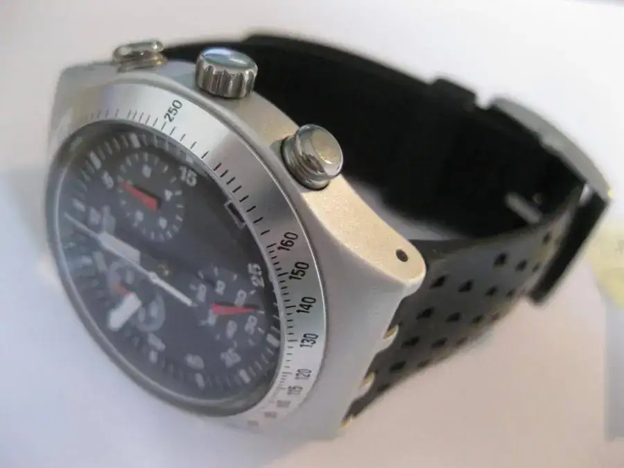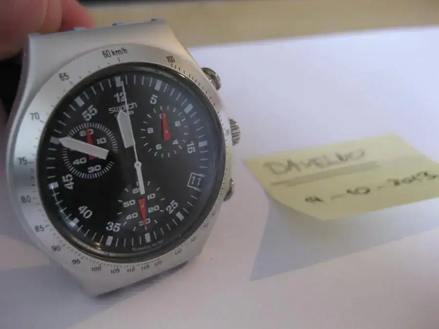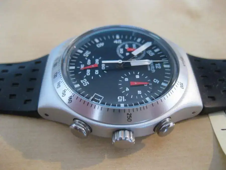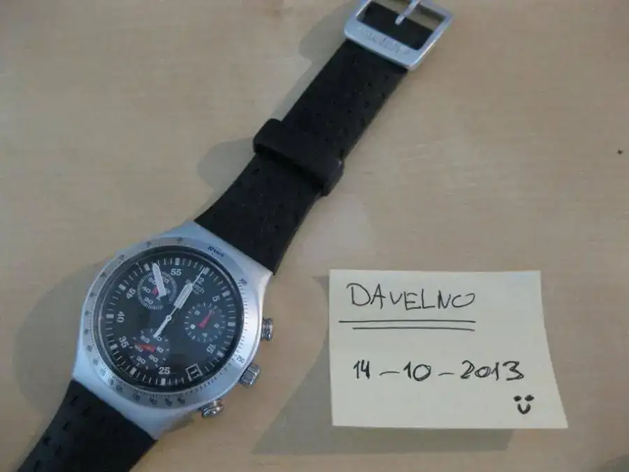 Hola, hola, ante la llegada de un nuevo amiguito y dentro del proceso de depuración de mi colección, pongo a la venta este Swatch Irony Chrono de Aluminio y de cuarzo, también conocido como "Wildly". El estado del reloj es muy bueno ya que ha sido comprado en Abril del presente año y lo he ido alternando con otros relojes. El único pero es que presenta algún pelillo en el cristal plástico habitual en los swatch, pero que es inapreciable a simple vista.