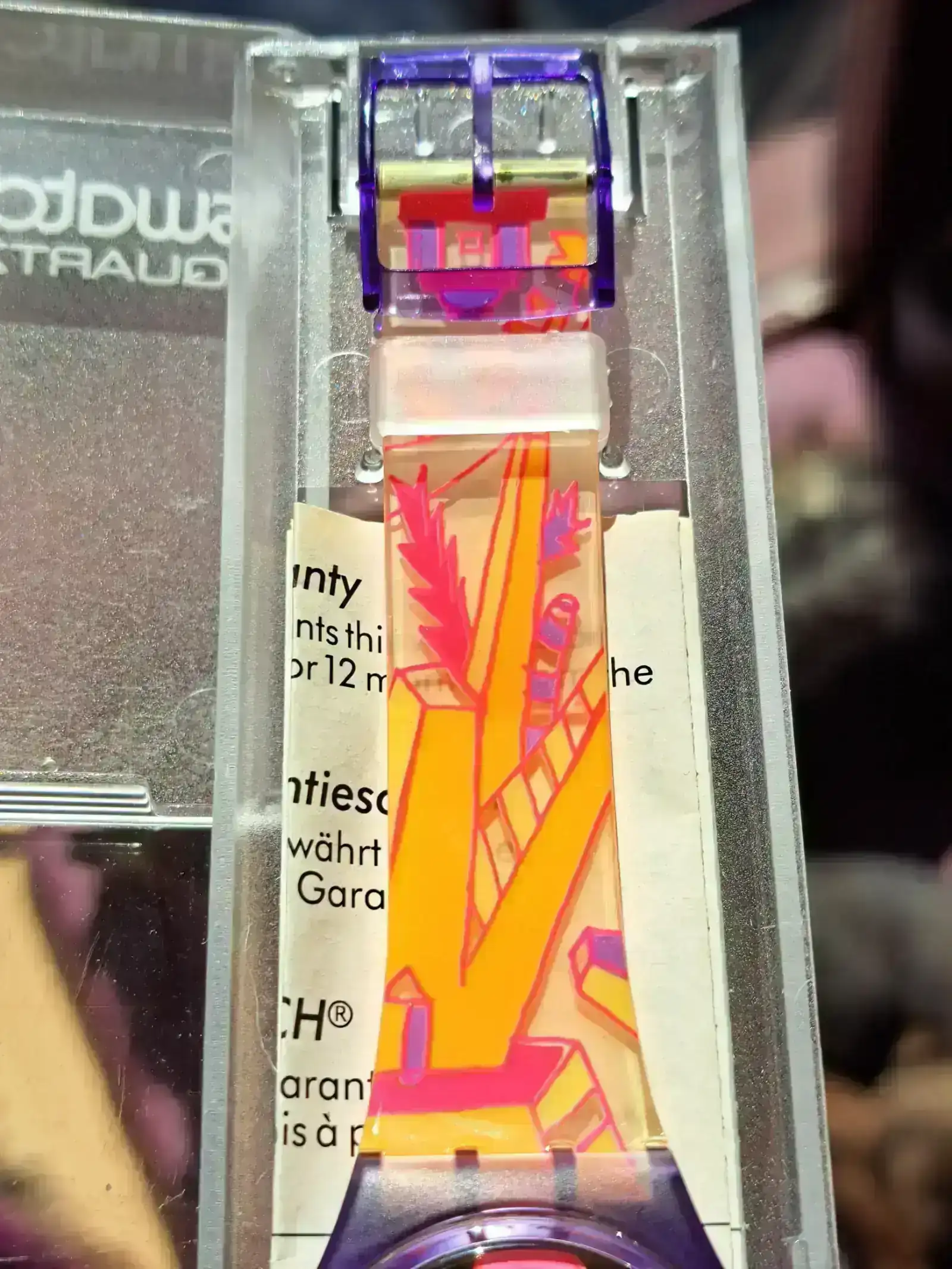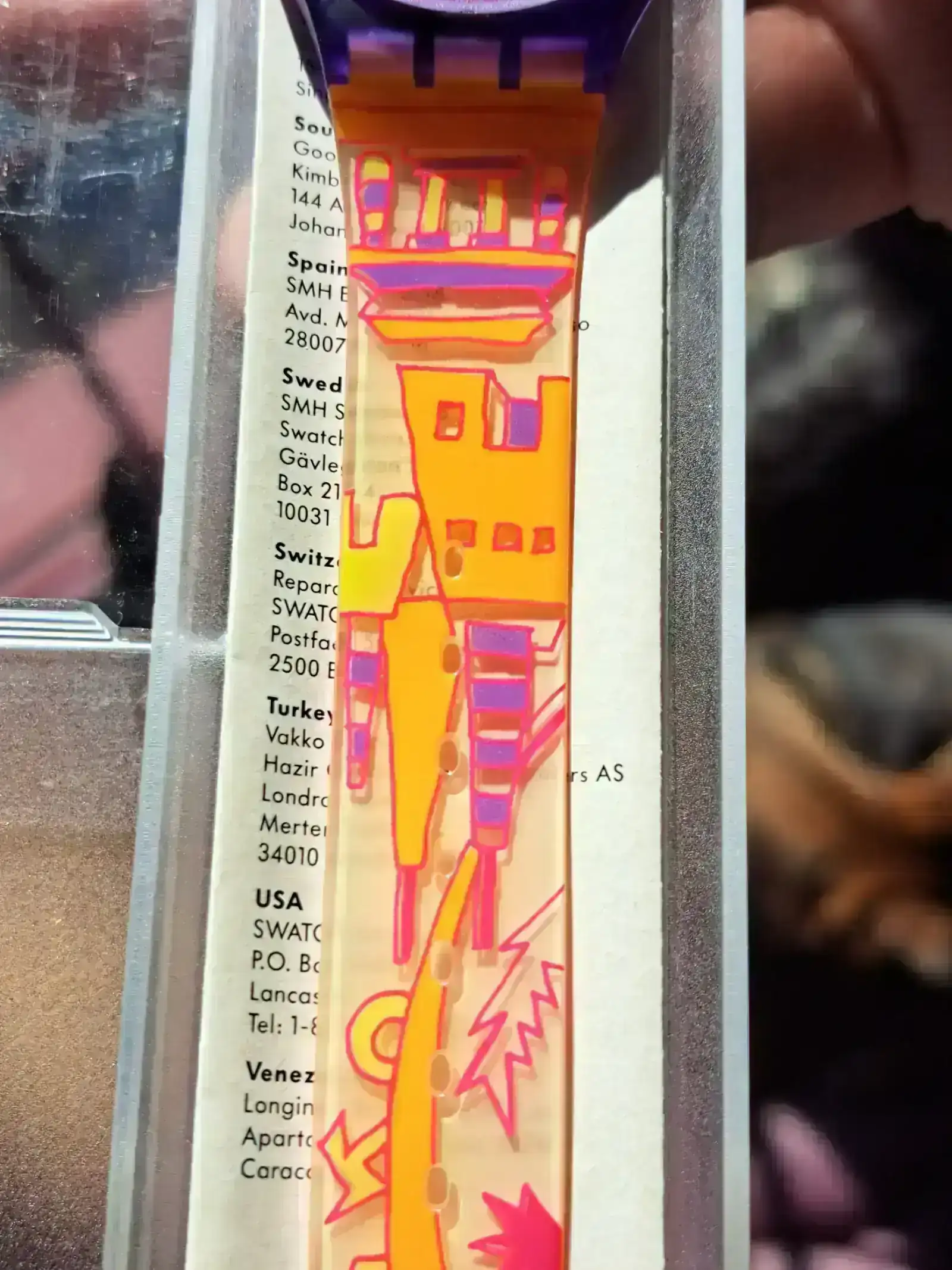 Caja de plástico de 34 mm, correa de plástico con múltiples patrones y colores, esfera naranja, rosa, azul y dorada sin índices horarios, agujas azules y en una caja violeta y transparente, un festival cromático que parece diseñado por alguien que derramó un arcoíris sobre un cuarzo suizo ETA de 8,75 mm de espesor. Sin cristal de zafiro, sin acero... Resistencia al agua de 3 bar, lo justo para que no le pase nada si te llueve encima...