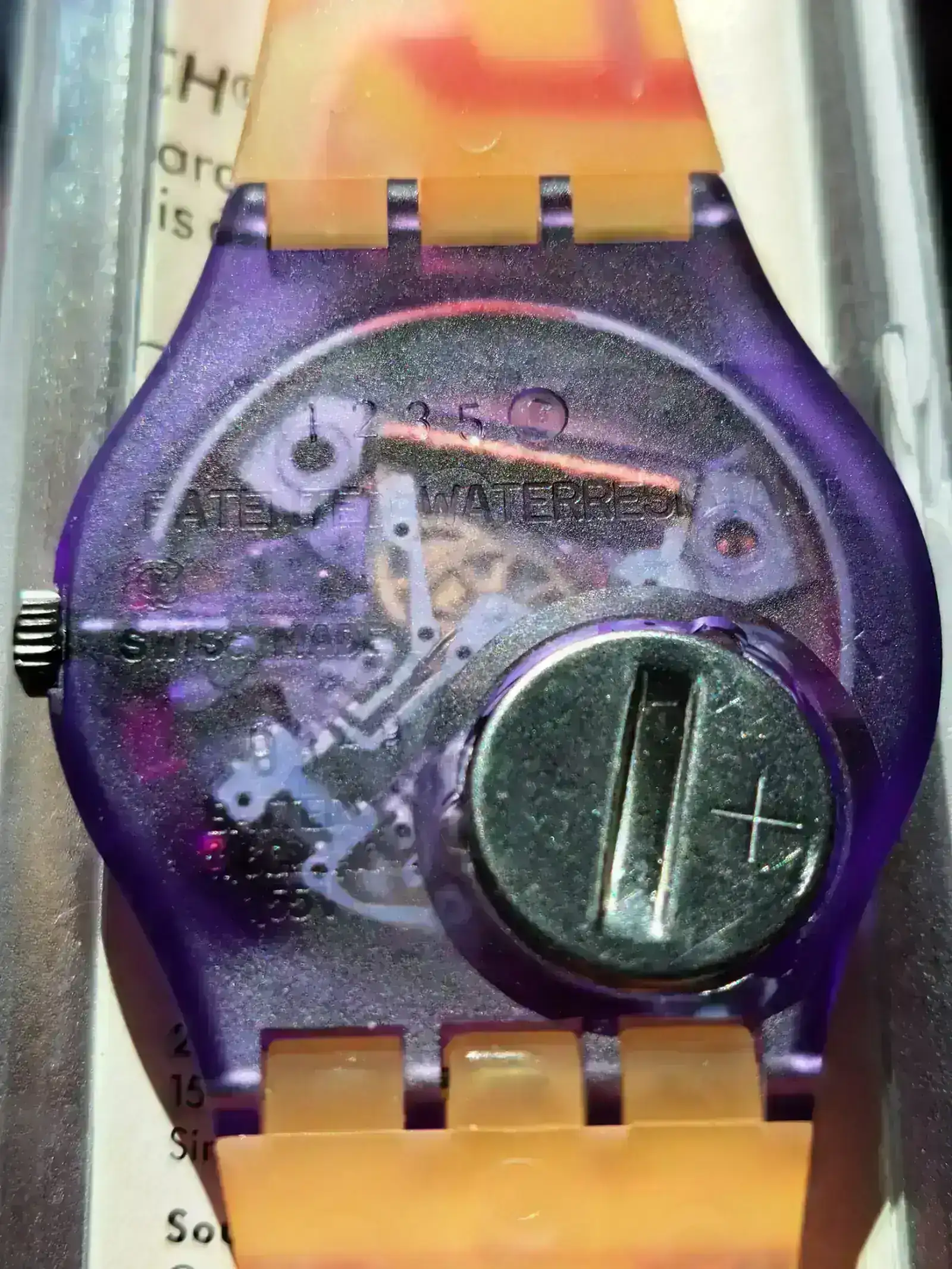 Técnicamente, el Rara Avis es un Swatch Gent estándar: 34 mm, caja de plástico, correa de plástico, movimiento suizo de cuarzo ETA, resistencia al agua de 3 bar, cierre de hebilla. No hay un PreciDrive termocompensado como en el Tissot. Es un reloj que costaba el equivalente a unos 25€ (62 si añadimos la inflación hasta hoy). cuando salió al mercado. Este que presento ha venido de Italia y marca un precio de 50.000 liras.