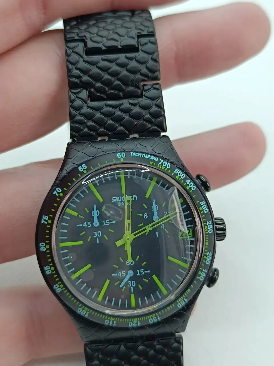 ES UN RELOJ QUE NUEVO VALÍA EN TORNO A 200 EUROS Y DIGO VALÍA, PORQUE YA ESTÁ DESCATALOGADO. EL MODELO NUEVO QUE TAMBIÉN ESTÁ AGOTADO (YOB100), CUESTA 240 EUROS EN LA PÁGINA SWATCH OFICIAL.