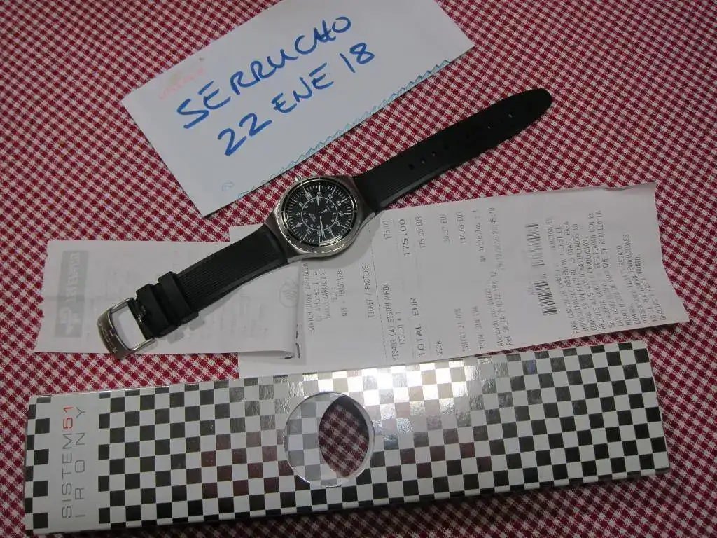 Empezamos con un swatch sistem 51 Arrow, como se puede ver en las fotos en garantía hasta diciembre. Es un reloj que me compré con mucha ilusión, pero al ponérmelo en casa ... no puedo con el sonido de sonajero que produce el rotor de plástico, es superior a mí, cuando me lo probé en la tienda no me percaté, pero en casa en silencio no puedo con él y no he vuelto a usarlo.