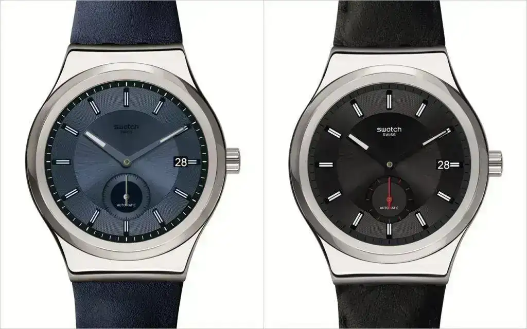 SISTEM51 Petite Seconde Black y Petite Seconde Blue son las nuevas apuestas de esta familia. Ambos tienen una subesfera pequeña con un segundero a las 6, así como una ventana de fecha en la esfera (negra o azul, satinada). La correa de piel, en negro o azul, y los apliques de Swatch redondean un diseño elegante.