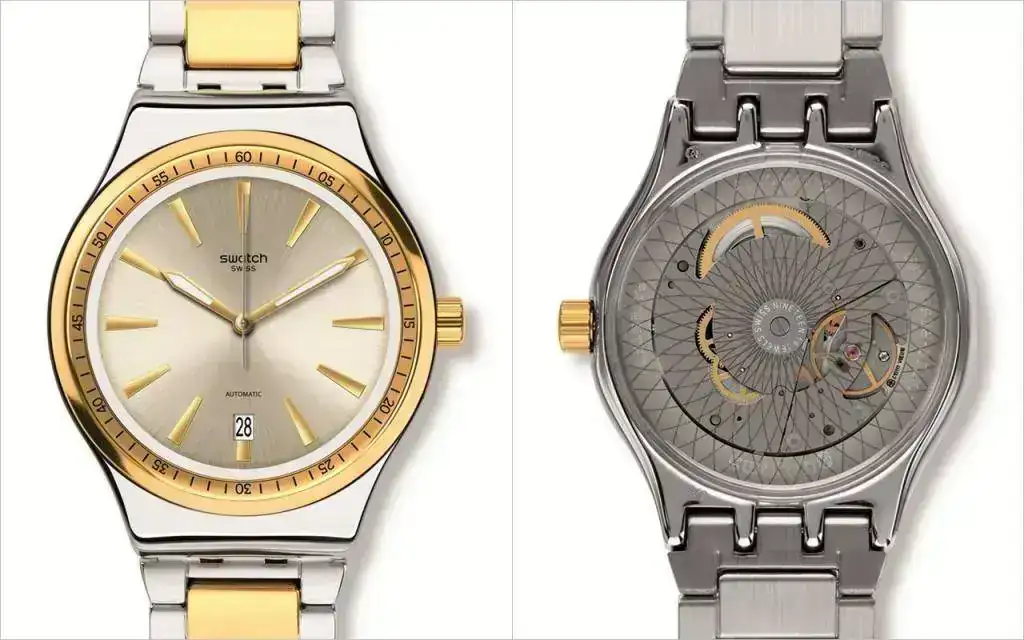 SISTEM Bling, es la tercera apuesta de esta familia. Un bicolor que combina acero inoxidable plateado y PVD dorado desde los apliques de Swatch montados en la esfera hasta el bisel grabado y el brazalete ajustable.