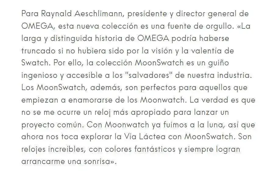 Es conocidisimo los lanzamientos que está haciendo Swatch en sus homenajes. La reflexión viene de que hoy en el store había una cola de unas 200 pax donde el 90% eran manteros que tras comprar el reloj a las 10:05 esperaba en la puerta para revenderlo por 800€. Ya no es el dinero, es la perdida total de encanto de no poderte comprar un reloj y tener que tratar con gentuza. Rebajarse al miserable nivel de arrastrarse a comprar el reloj a un mantero, en el absurdo de pagar más dinero de lo que lo podrás comprar en un par de meses teniendo la experiencia de compra que se debería tener.
