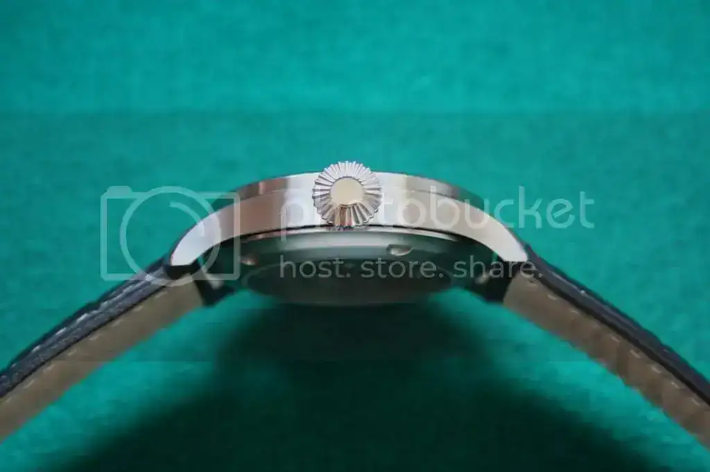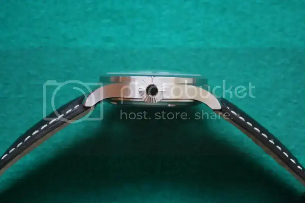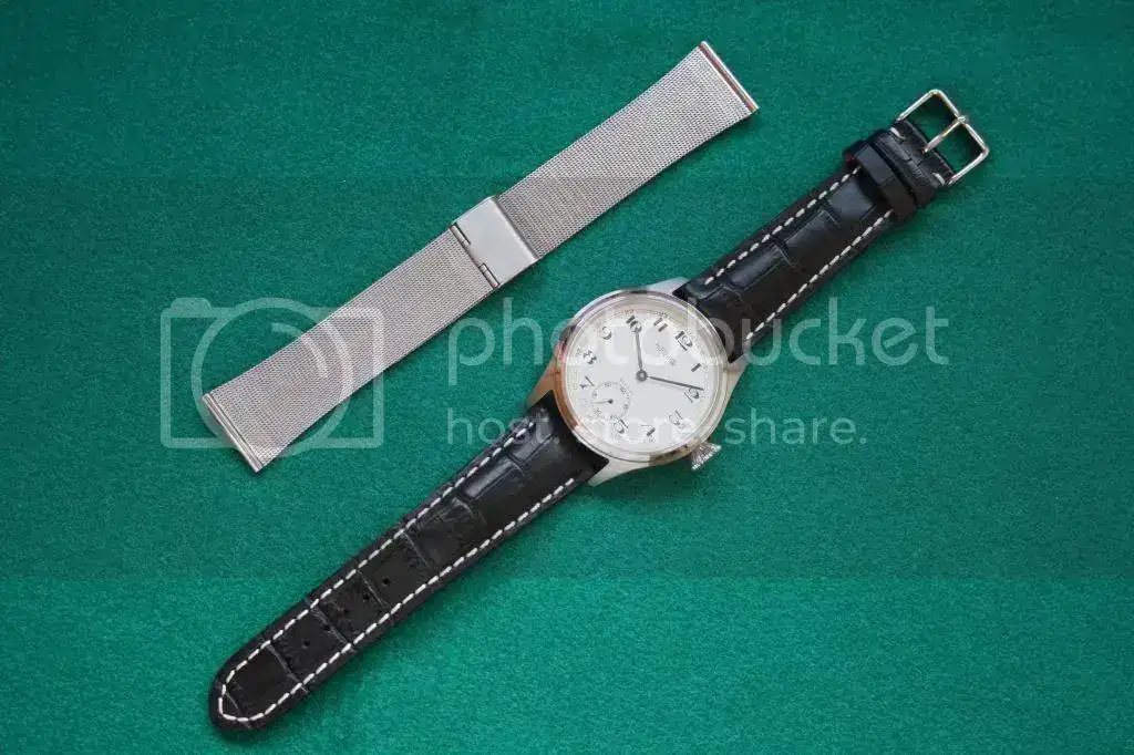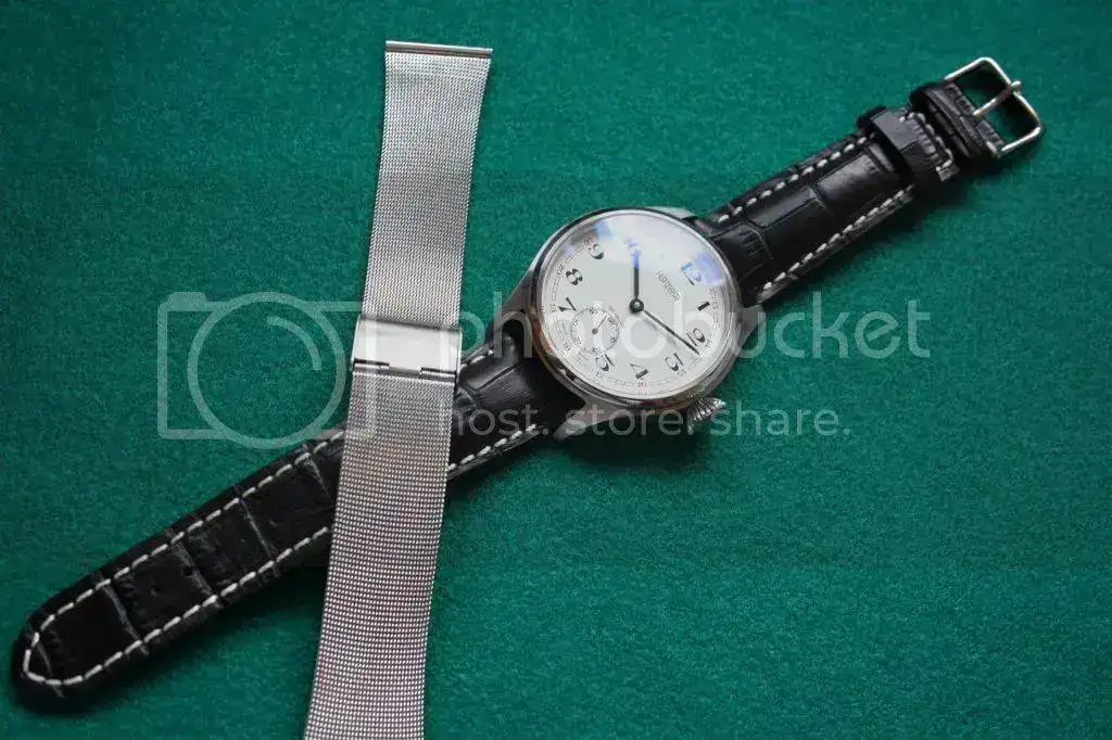 Lleva puesta una correa de un buen grosor de piel y de calidad fantástica y flexible. 24 mm de asa. Con la milanesa fina que incorporo en el paquete queda genial.