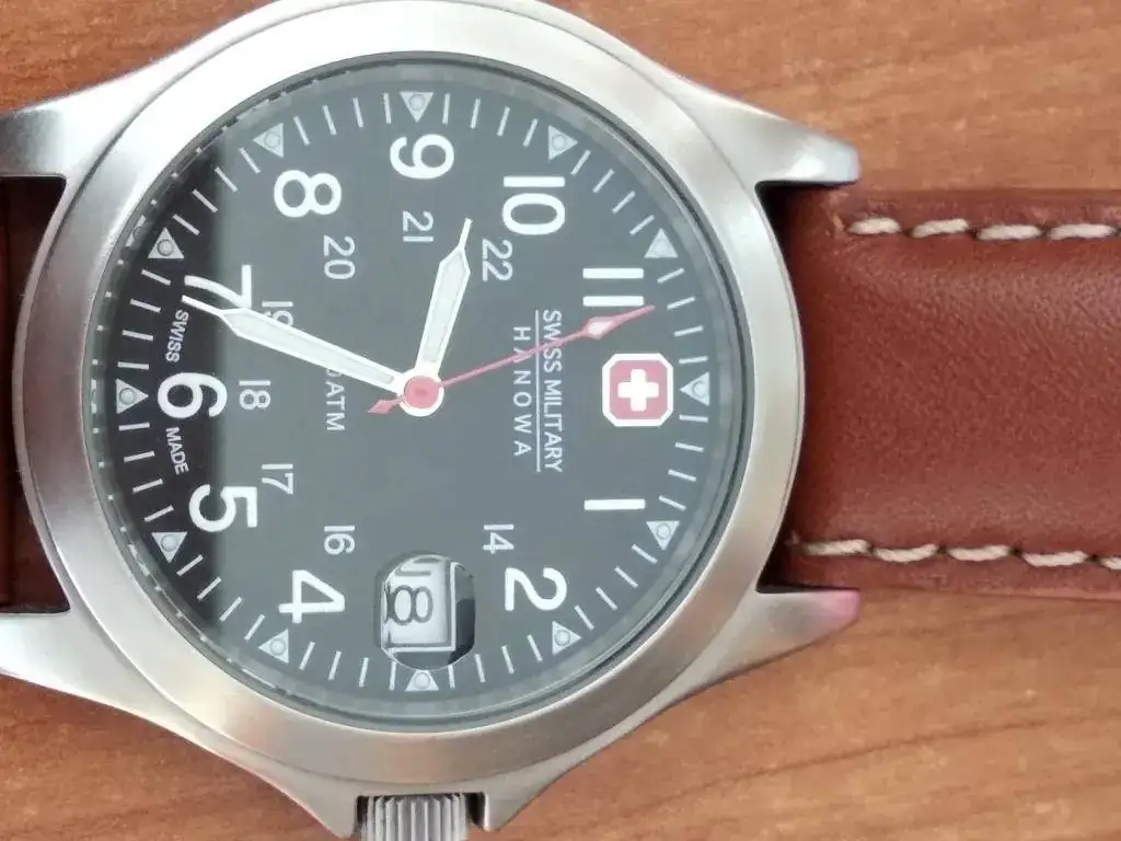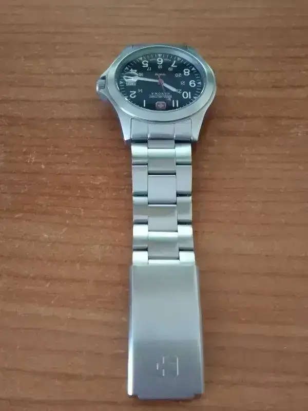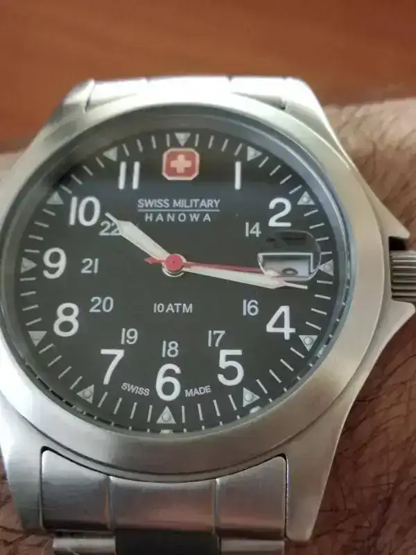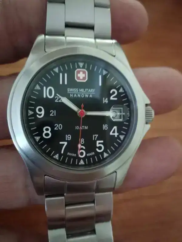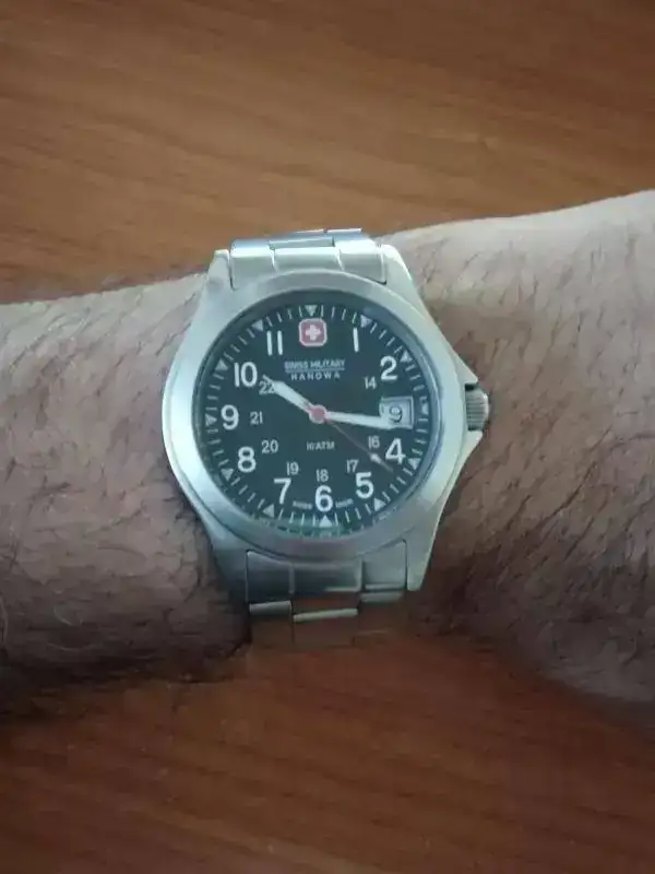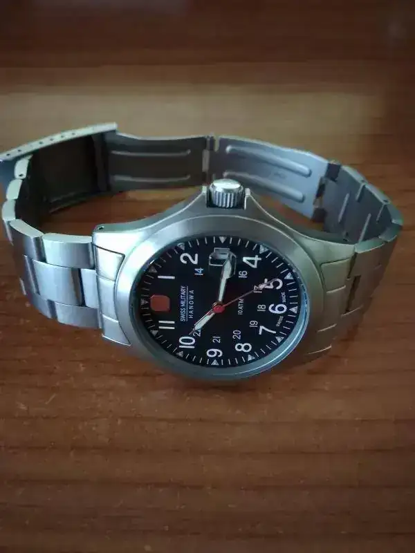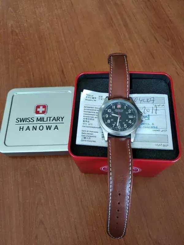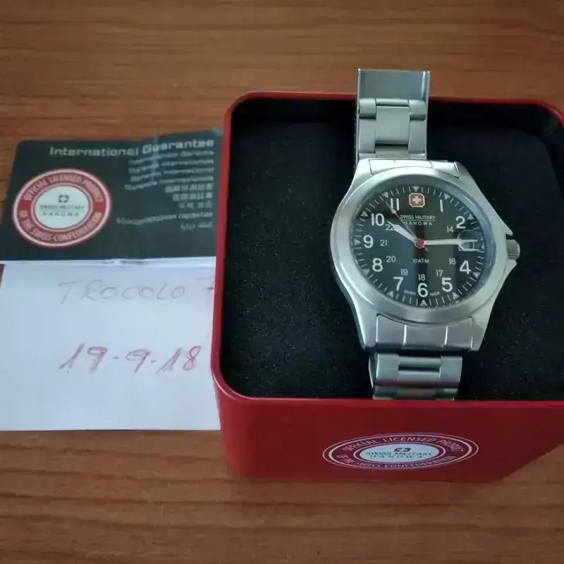 Buenos días. Vendo mi Swiss Military en perfecto estado, de reestreno. Ya descatalogado, al menos eso me han asegurado, que este modelo con lupa ya no se fabrica, pero no lo puedo certificar. Decir que, como sabéis, la caja de este reloj viene arenada o satinada, como se quiera llamar. Yo mandé a mi relojero que me cepillara la caja y el armis y sinceramente, queda más bonito que de la otra manera, aparte de que el cepillado fue perfecto. Viene completo, cajas exterior e interior, garantía vigente (12/2017) y armis original que compré aparte, ya que este modelo viene con correa de piel. Muy cómo de llevar y su funcionamiento es perfecto y muy preciso. Ahora, cuadro y fotos.