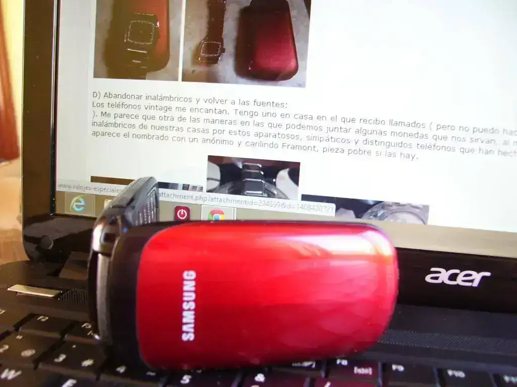 Como es de público conocimiento, mi móvil es un Samsung. Feliz con él, ando por la vida desconectada de todo tipo de redes o webs invasivas; hago y recibo llamados; envío mensajes y me los mandan: y ahí se terminó el uno del móvil. Más allá de lo que yo piense, me parece que un aspecto negativo de mi personalidad es no poder afrontar las urgencias tecnológicas tal y como se presentan en la actualidad; no está bien esa suerte de desconección absoluta con ese mundo subterráneo, misterioso y virtual de las comunicaciones interpersonales de este nuevo siglo. Dicho ésto, seguiré con mi Samsung feliz y contenta, pues es una manera de poder ahorrar en compras costosísimas de equipos muy frágiles, que si los miras ya se rompen. Invito, pues, a todos ustedes a volver a ese primer amor que fue el Nokia 1100 ( una gloria absoluta ) y que los dineros destinados a la compra de equipos de última generación se pospongan hasta la vuelta del anhelado viaje. Acompaña al Samsung, uno de mis relojes de infancia, un Mervos despojado y sin caché, ideal para muñecas que saben de los sacrificios del ahorro: