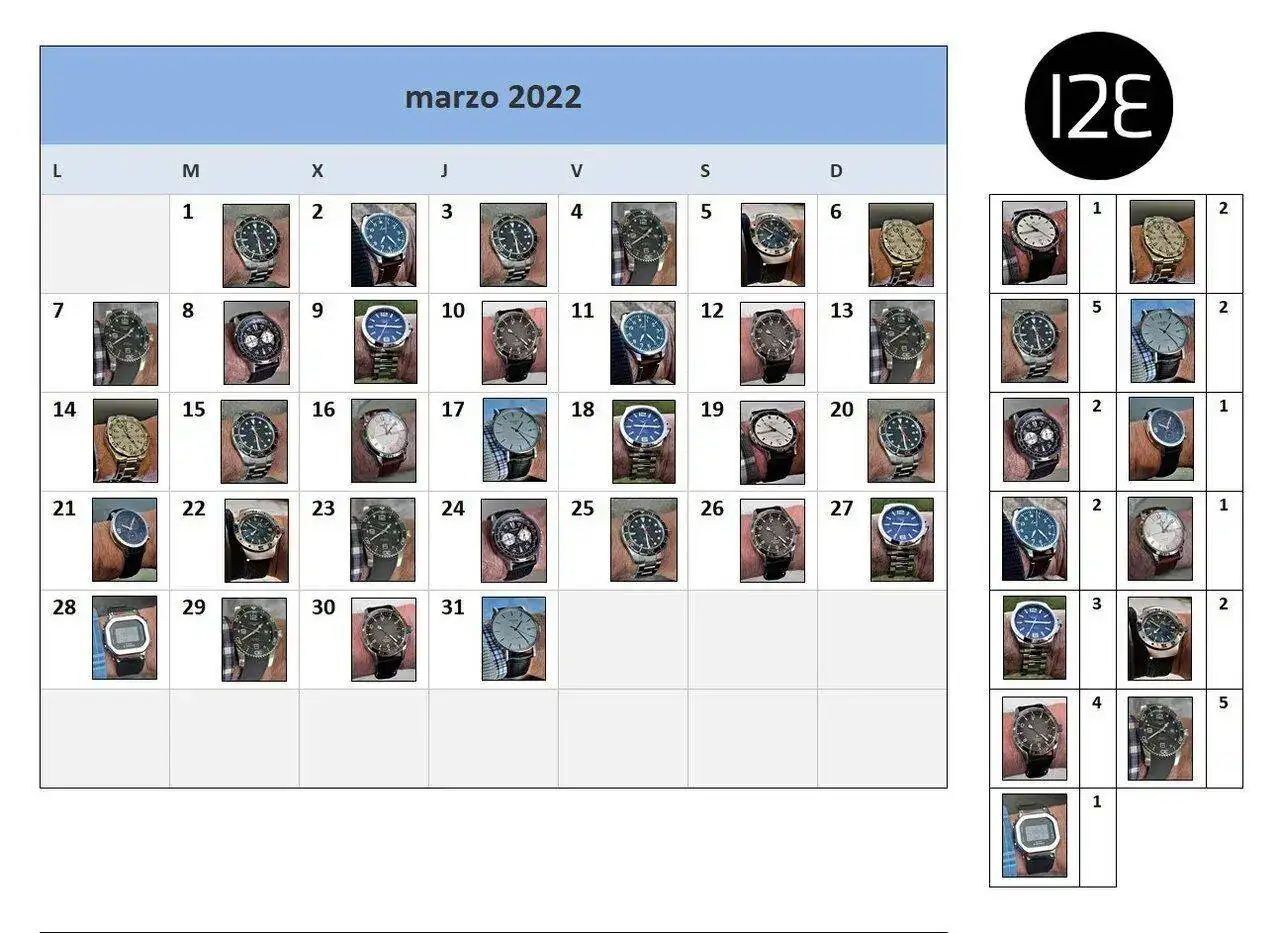 Se trata de una tabla de Excel con un calendario de todo el año que se puede bajar de cualquier sitio de la red y personalizarlo a tu gusto, en la casilla de cada día copio la imagen del reloj que subo en la foto del hilo diario, y en las columnas de la derecha voy sumando los días que ha salido cada reloj en ese mes, así sin darme cuenta se que reloj me pongo mas a menudo, como digo es una tontería pero bueno es mía.