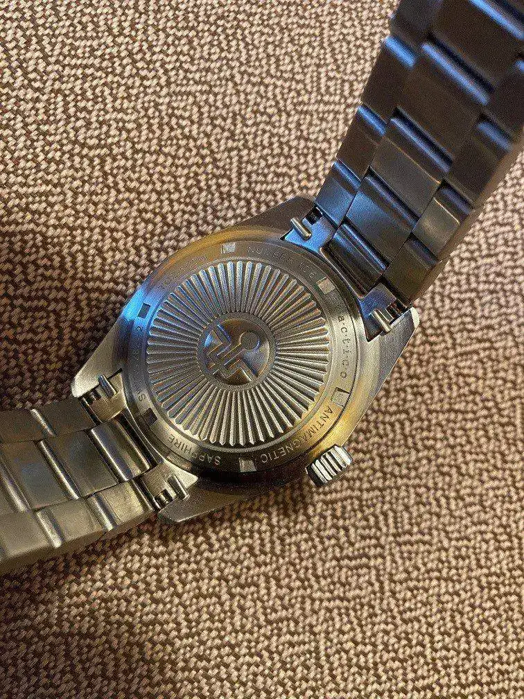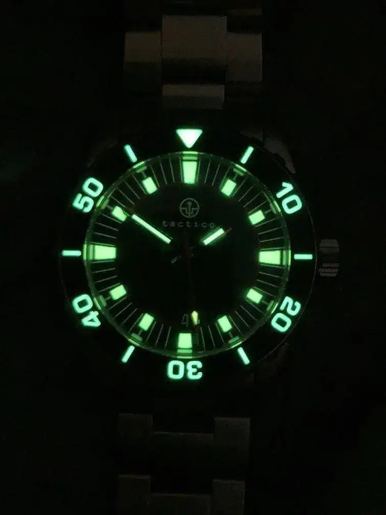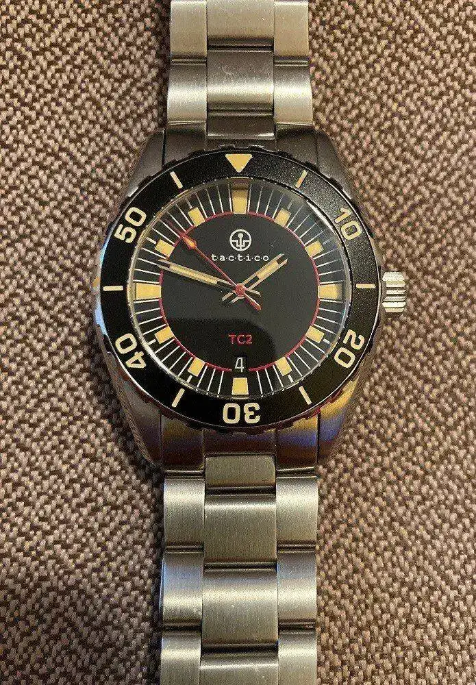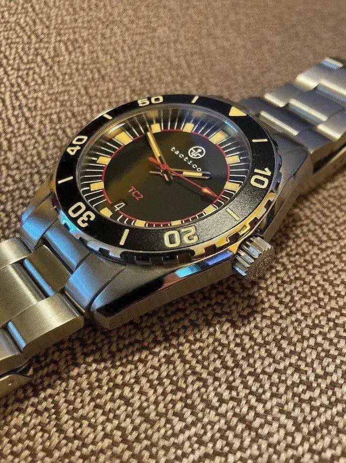 This is the Tactico TC2, Tactico is a sister brand of Crepas. Quite rare when it comes to watches, with only 169 made, the number is engraved on the case back. It is inspired by an Eterna Kontiki from the 60s and is a solid, well made and capable watch. Antimagnetic at an impressive 70,000 A / m, which puts it well above the usual protection of 4,800 A / m that other so-called antimagnetic watches tout. The bracelet is Tactico's upgraded bracelet with solid end links, not the cheaper bracelet they were initially wearing. Included in the kit are 2 nato straps, 2 additional bracelet links, a cleaning cloth and the waterproof case. I have a hard time finding noticeable scratches.