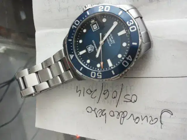 Tag heuer Aquaracer 300m calibre 5, Azul. automático, esta en muy buen estado, leves arañazos en cierre y finísimos en armis, (hay que buscarlos expresamente). Es de agosto de 2013, según reputadisimo forero, y según el se compro en Andorra, se llevo puesto y se tiro todo lo que no es reloj, para no pagar impuestos en Aduana. Adjunto un escrito/contrato del forero anterior como prueba de que se trata de un reloj completamente licito. Tiene eslabones para muñecas de hasta 18 cms, (creo yo). La marcha yo diria que es como la de un cuarzo, no le note que adelantara ni atrasara después de hasta 7 días de uso continuado.