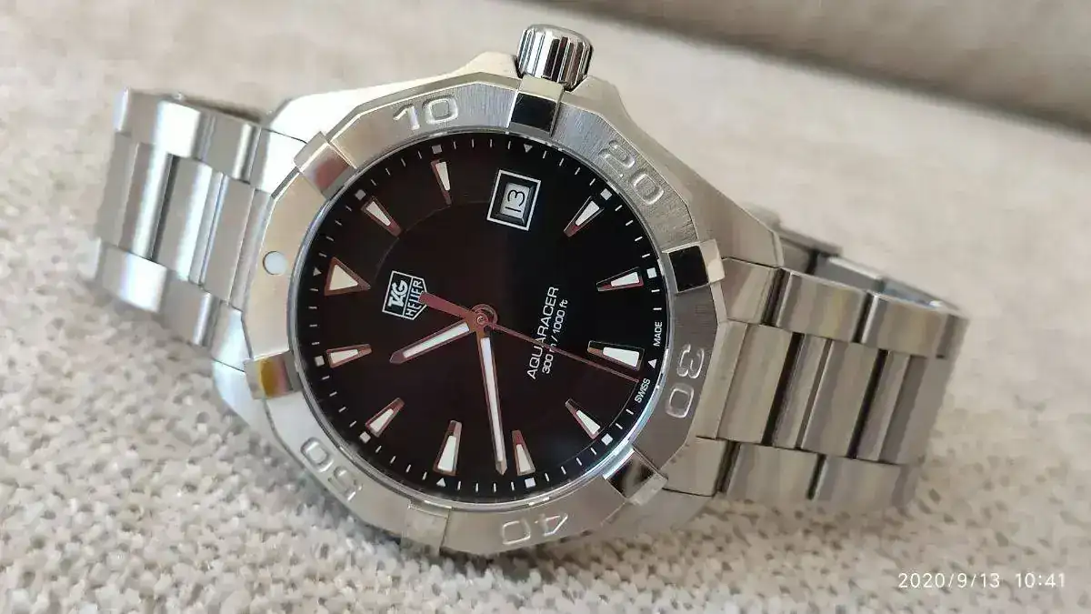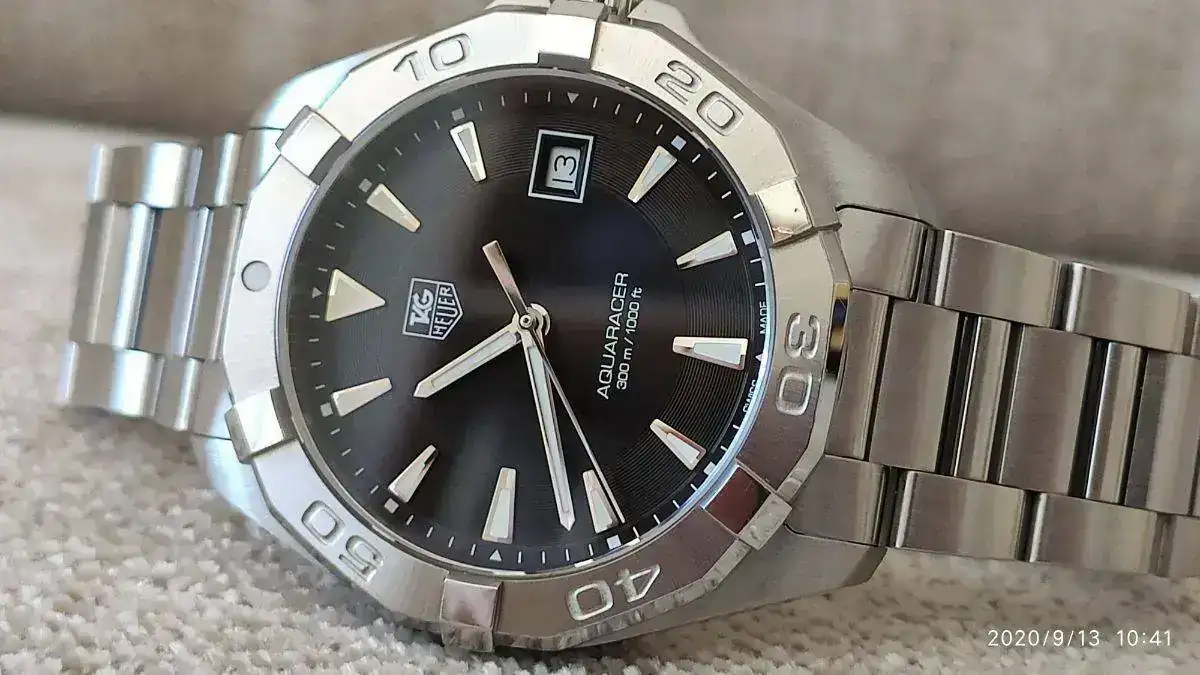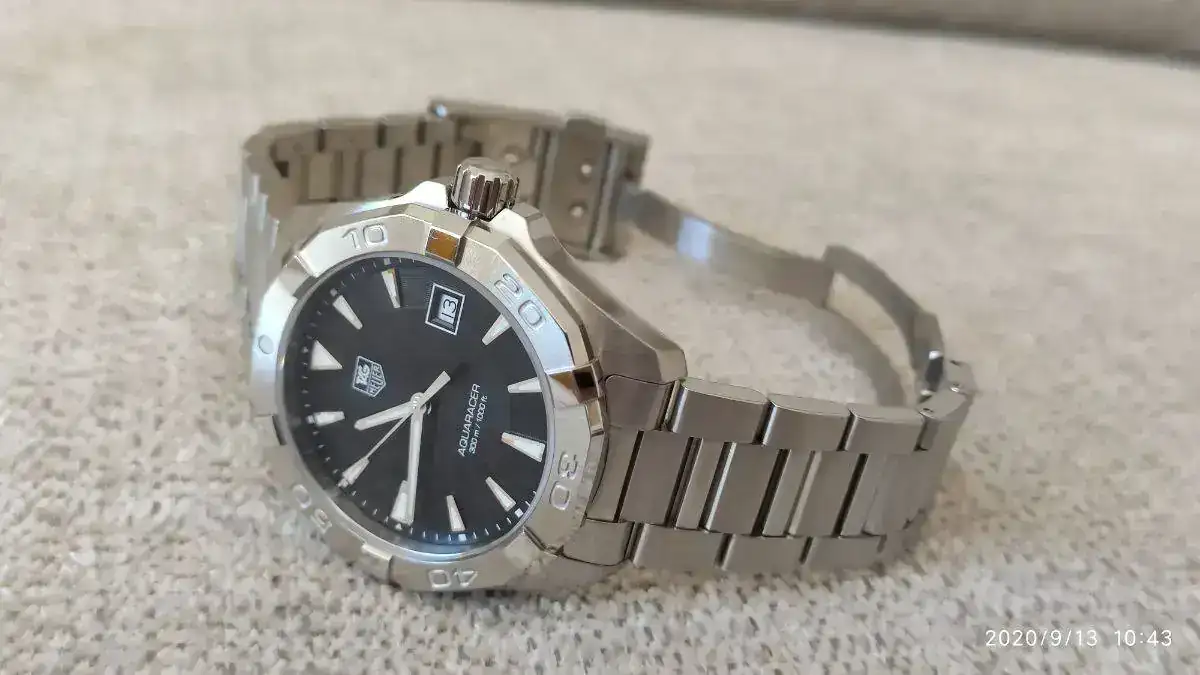 Se trata de un Tag Heuer Aquaracer de cuarzo, modelo WAY1110. Es de esfera negra con relieve circular, con índices aplicados, corona y fondo a rosca, sumergible 300 metros. Cristal de zafiro plano con AR interno. Cierre de botón doble y desplegable de buceo, con brazalete de acero y bisel de acero. Tiene la característica de que viene con el armis de los modelos superiores, los Carrera, y no con el clásico 3 piezas de los Aquaracer, lo cual le da un plus a mi parecer en el apartado estético.