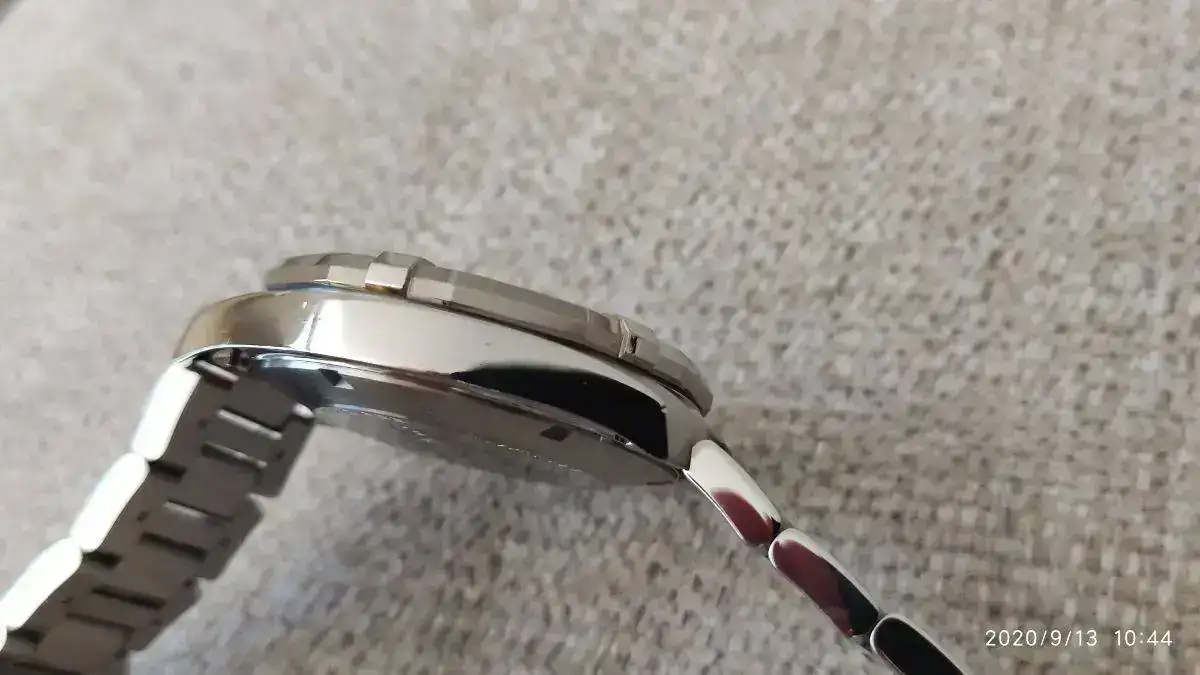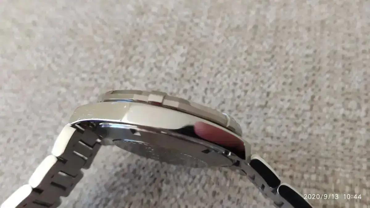 Su estado es muy muy bueno. Ligeros pelillos en las zonas pulidas que son inevitables (laterales de caja y castilletes del bisel), y uno ínfimo en el cierre. He tratado de que se vieran en las fotos. Si alguien precisa más, que me mande un privado y le mando las fotos en alta definición.