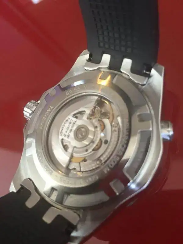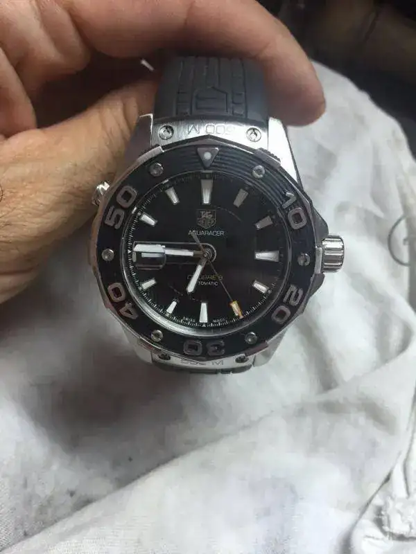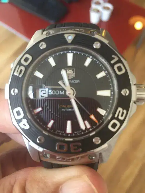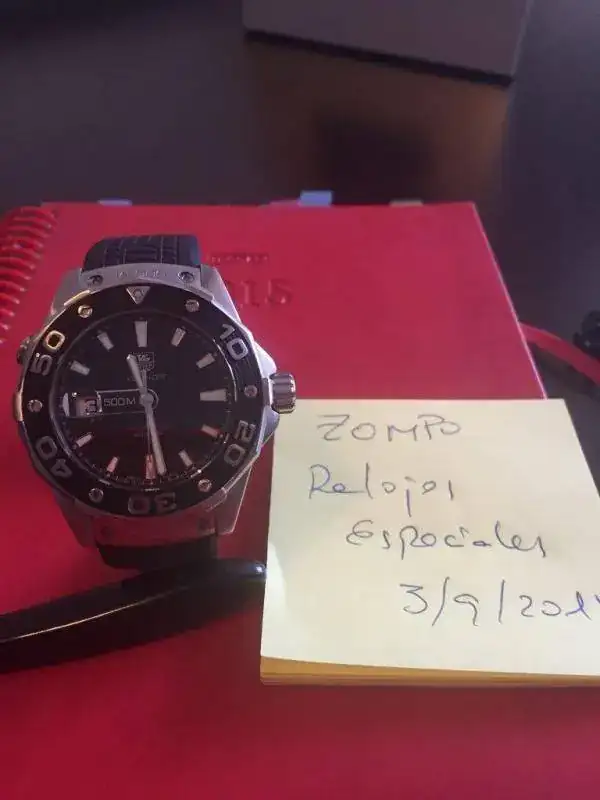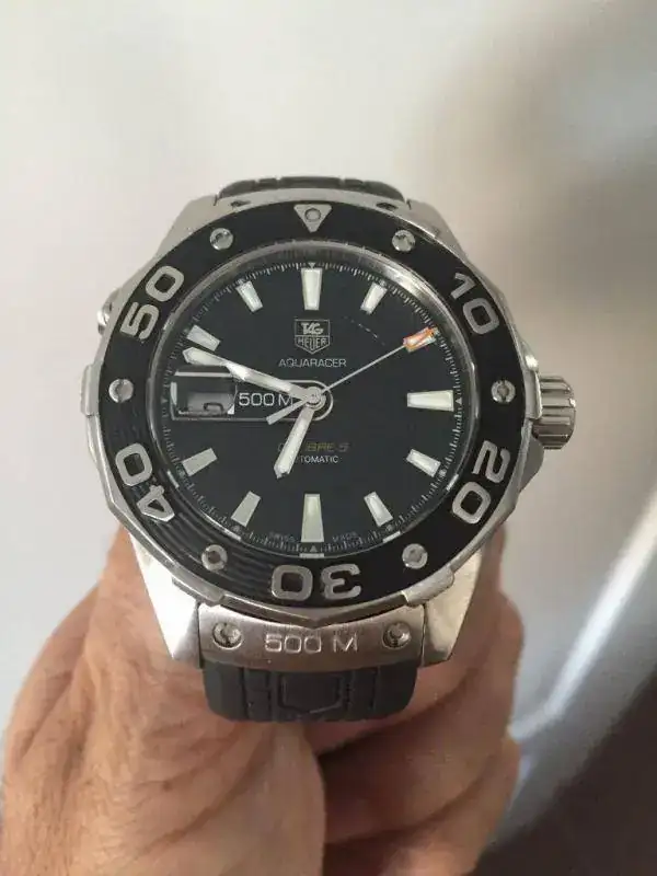 Saco para cambio por falta de uso este Tag Heuer AQUARACER 500M Calibre 5 Ref. WAJ2110. El reloj se encuentra en muy buen estado, sin marcas reseñables, salvo una que se ve al trasluz en el bisel. No soy capaz de sacarla en las fotos.No ha tenido mucho uso.No tiene documentación ni caja, no las encuentro, pero garantizo su autenticidad. El reloj funciona perfectamente. Cuando lo llevo, no noto que atrase, ni adelante, pero no soy un maniático de eso y no puedo decir lo que atrasa/adelanta al día.