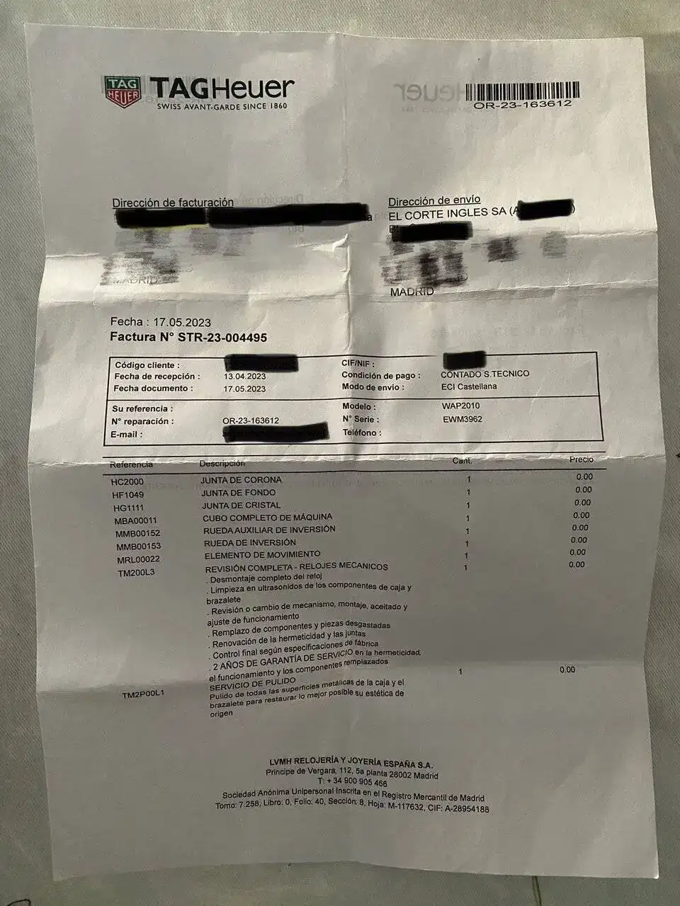 Pongo a la venta sin cambiod este Tag Heuer Aquaracer 300 de 41mm. Lo compre en el foro hace poco y me lo he puesto tres días, ya que a poco de comprarlo adquiri un Carrera que llevaba ttiempo buscando; es el único motivo por el cual me desprendo de él, ya que es un reloj equilibradamente elegante, deportivo y comodísimo. En Mayo de este año se le hizo una revisión completa + pulido en el SAT, por lo que quedó casi sin marcas a excepción de alguna oequeña cosa en el bisel. El estado general es excelente y luce espectacular en la muñeca. Adjunto foto de la factura de SAT del antiguo propietario omitiendo datos personales o podeis ir a su anuncio en este mismo foro a verlo.Aun le queda mas de un año de garantia de la revision.
