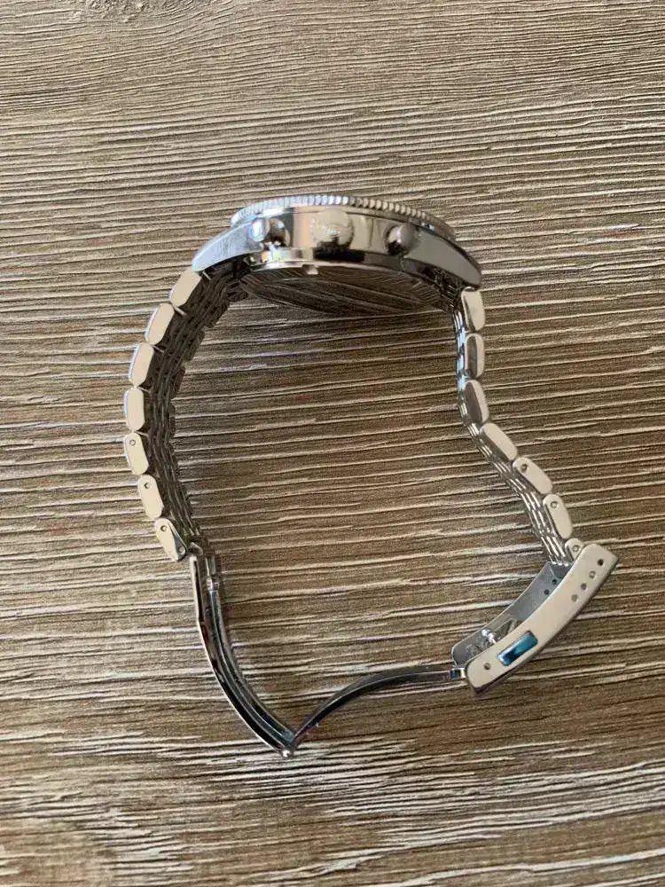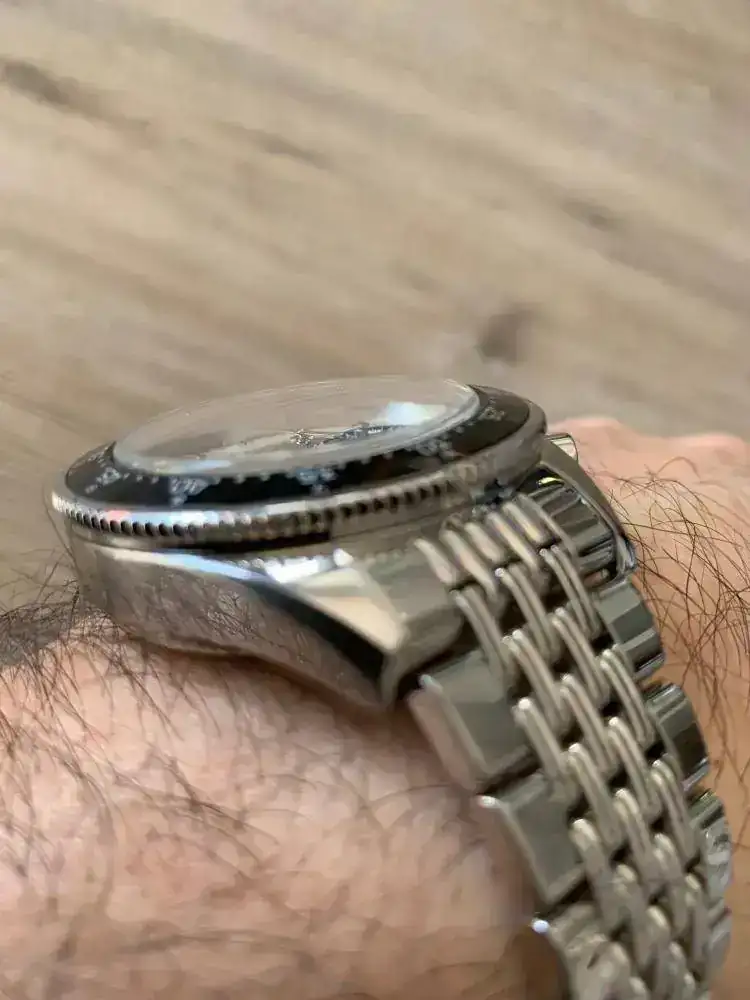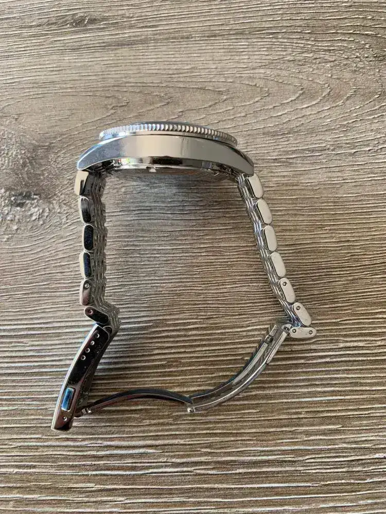 El reloj se podría decir que es nuevo ya que está usado unas 4 veces por casa y ya, no ha salido a la calle, no tiene marca ninguna, aún conserva algunos plásticos puestos. Ni pelos ni sombras ni rayas y este reloj al ser pulido espejo canta rápido.