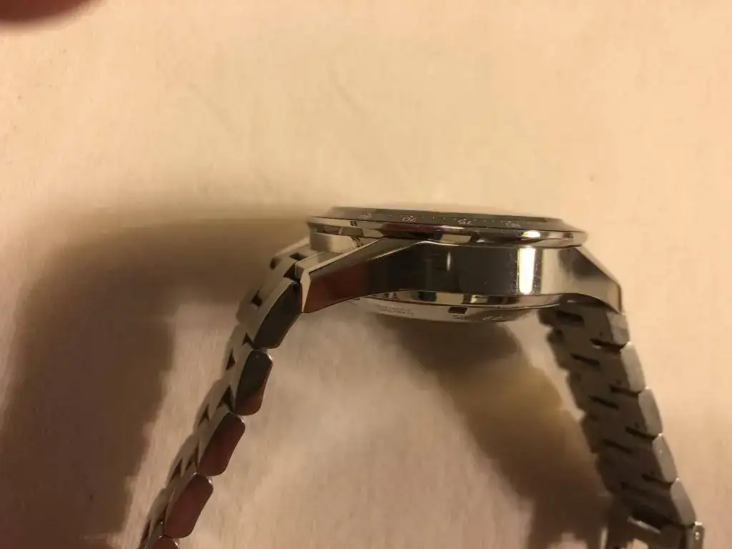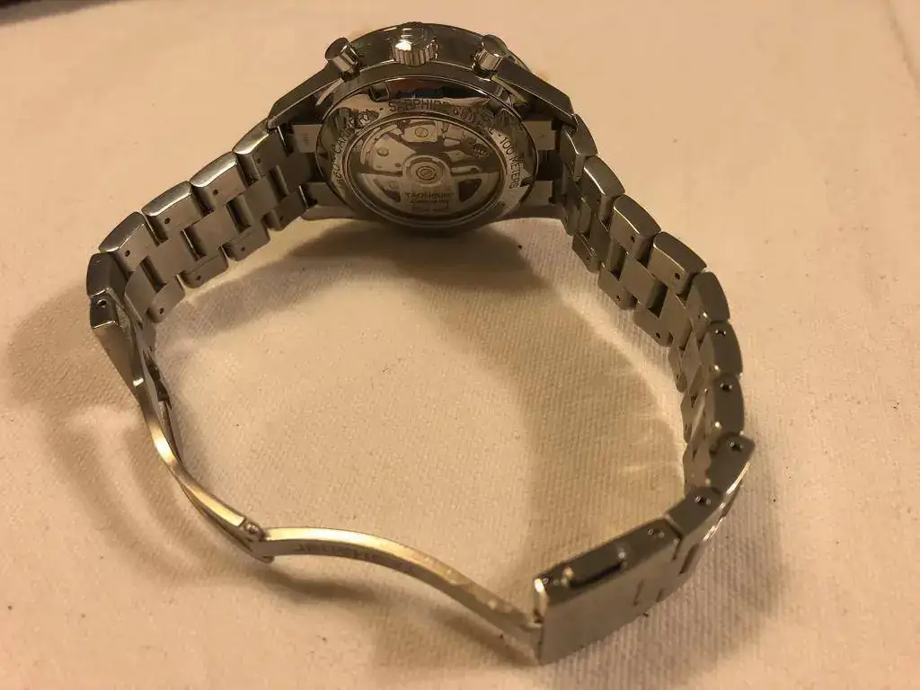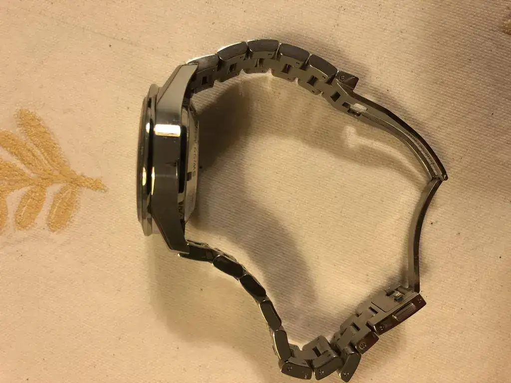 Está en un muy buen estado general; pequeños roces en el armis y más pequeños en la caja Realmente son muy leves, pero en un reloj con acabado brillo son inevitables. Cuando te pones el reloj realmente no se ven. El zafiro tiene una raya más o menos en el centro, que solo con algún ángulo concreto de luz se ve; pero ahí está.