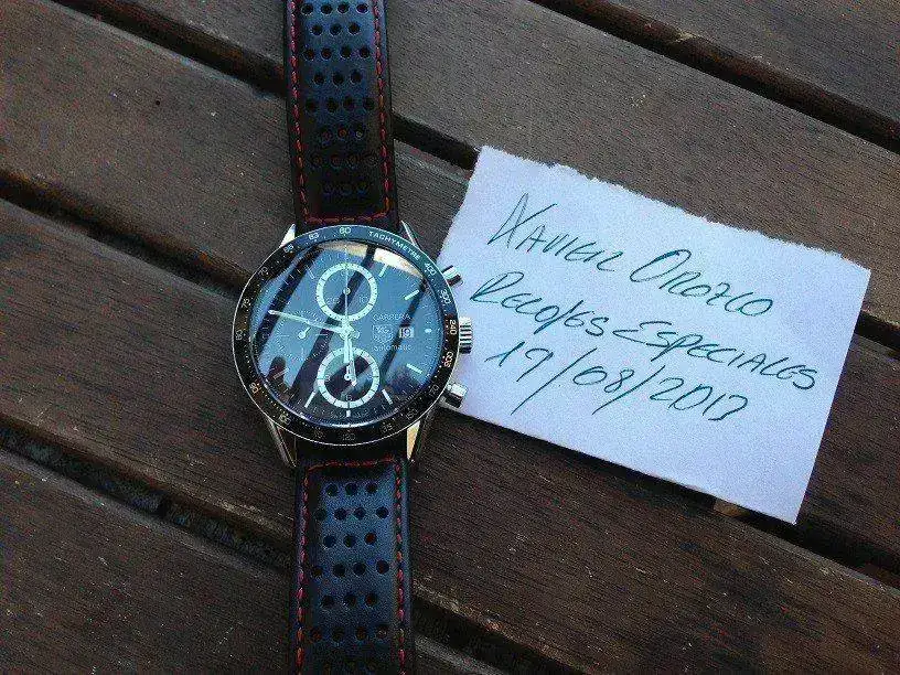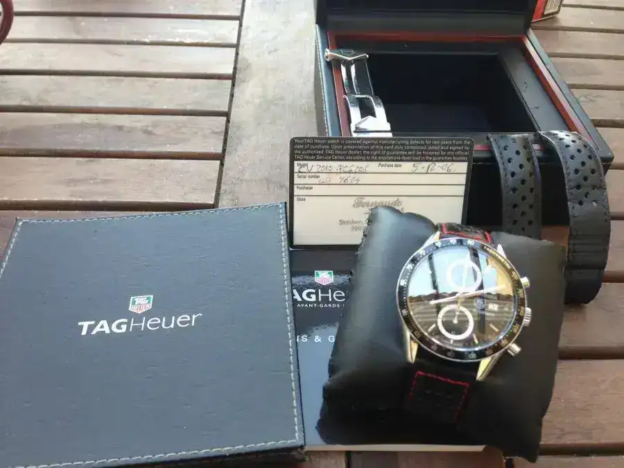 Tiene su correa tag y el deplo tag, la correa esta usada, aun le queda vida, pero poca, tambien una de cuero que se ve en las fotos que le queda perfecta, tiene su set completo, excepto la caja de carton que no tiene creo mas importancia, librito, caja de cuero, garantia...si estan.
