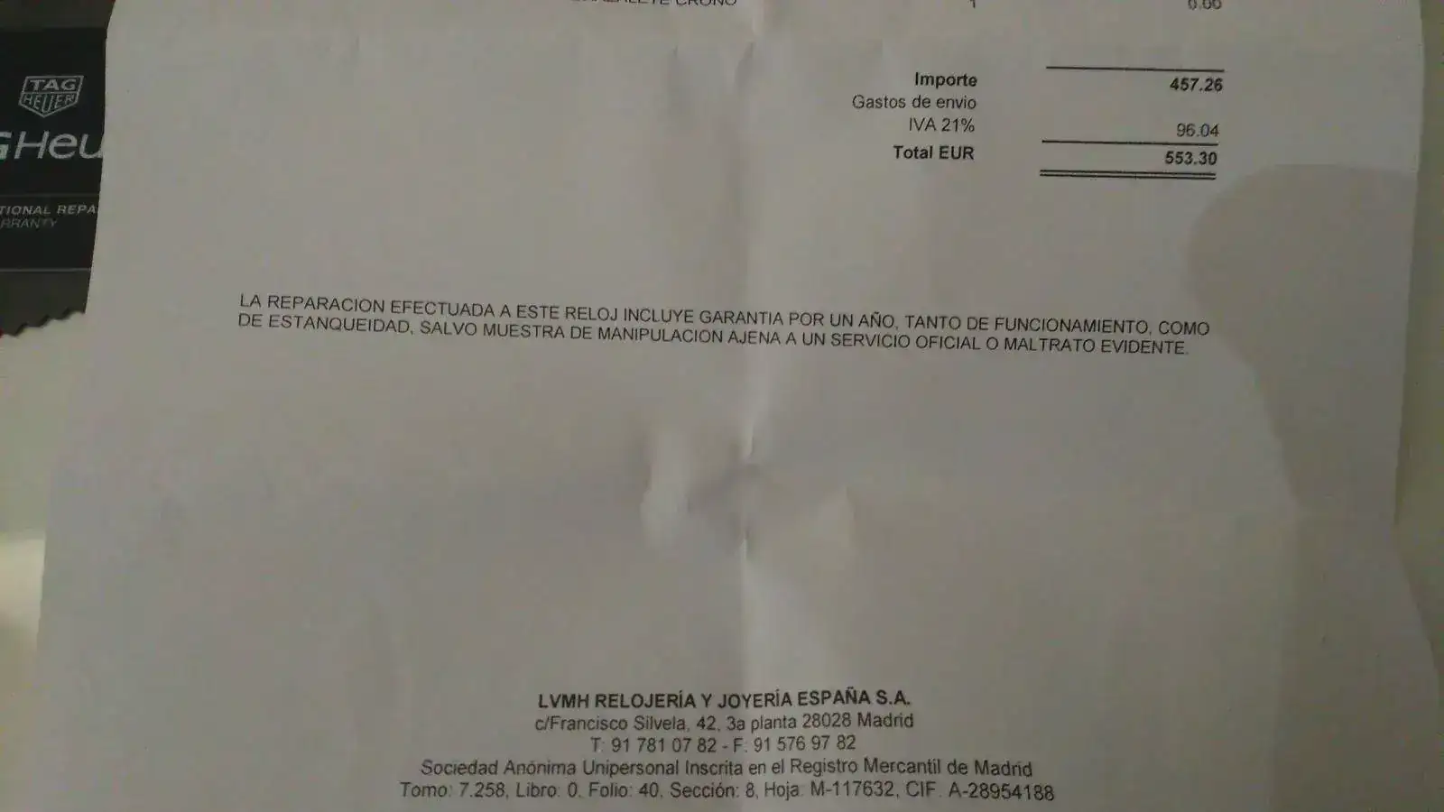 Documentación y tipo de la misma: Tarjeta de garantía internacional TAG HEUER y factura de la revisión.