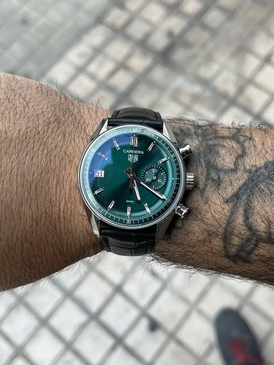 Uno de los cronógrafos de la colección Carrera con más personalidad, el llamado 45 Dato de 1968, es reeditado con esfera verde y contador parcial de 30 minutos (en lugar de los 45 originales) junto con el llamado "glassbox", el zafiro abovedado que cubre la esfera.