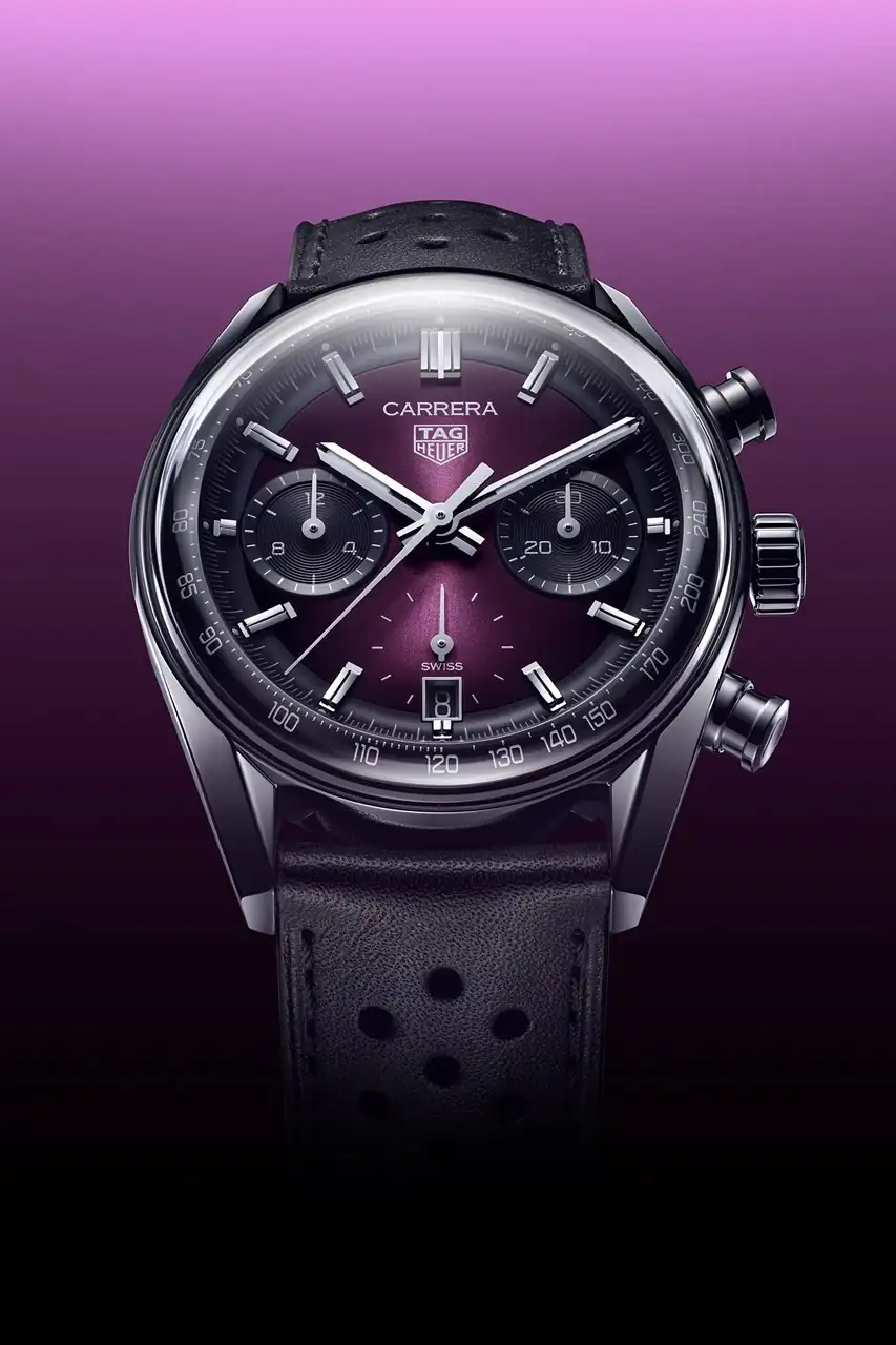 Partiendo del lenguaje de estructuras que ha definido la serie Glassbox desde el 60 aniversario, los nuevos modelos del TAG-Heuer Carrera amplían la paleta de colores de la colecció con un morado que ya triunfó en el Monaco presentado en 2022. Las esferas de los nuevos Carrera están realizadas con un suave efecto degradado, que pasa de un negro intenso en los bordes a un morado intenso en el centro. Los contadores del cronógrafo muestran un acabado completamente negro azuré resaltado con detalles plateados para mayor claridad y contraste. El cristal de zafiro abombado Glassbox realza aún más la estructura curvada de la esfera.