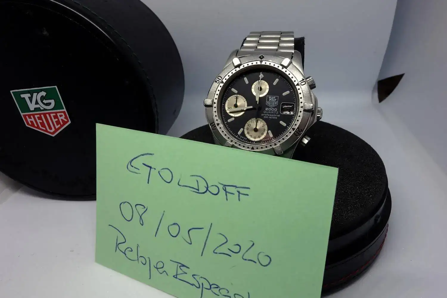pongo a vuestra disposición este reloj noventero con un -para mí- acertado diseño. Se trata de un TAG-Heuer serie Sport 2000 en un estado bastante bueno para los años que tiene, a las fotos me remito. El único pero estético es ese golpe que se aprecia en la carrura a la altura de las nueve y que he circulado en rojo pero no se ve con el reloj puesto. En cualquier caso no afecta a la marcha del movimiento que, como buen heredero de la famosa crisis, es de cuarzo. El tritio está perfecto de color y todavía está activo. Cristal de zafiro sin ninguna rayada ni siquiera en el AR (si es que lo llevara). Tiene una lupa de fecha interna que le da un toque curioso. Ver