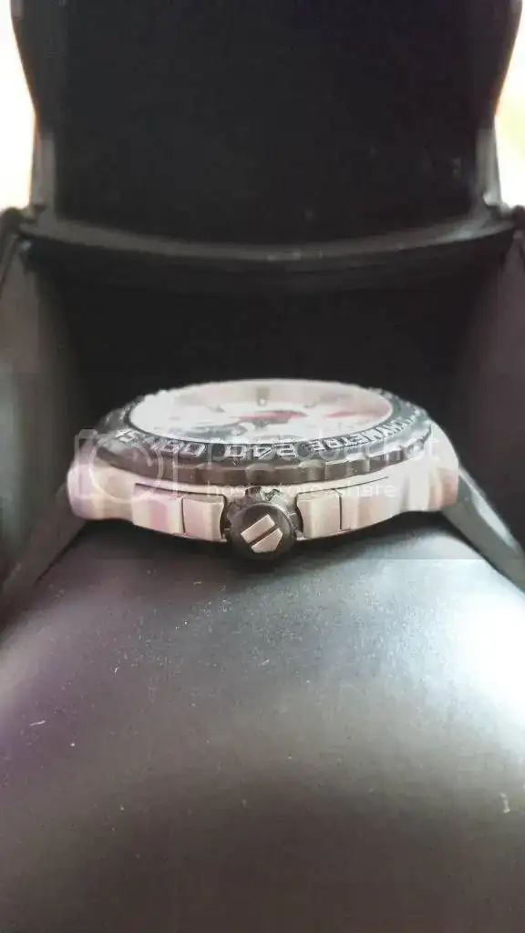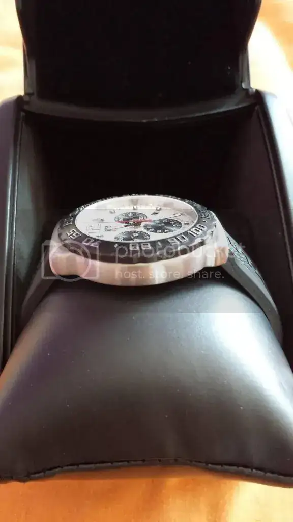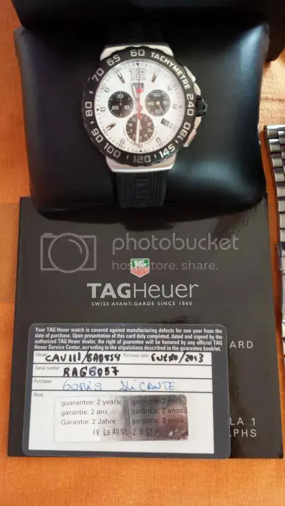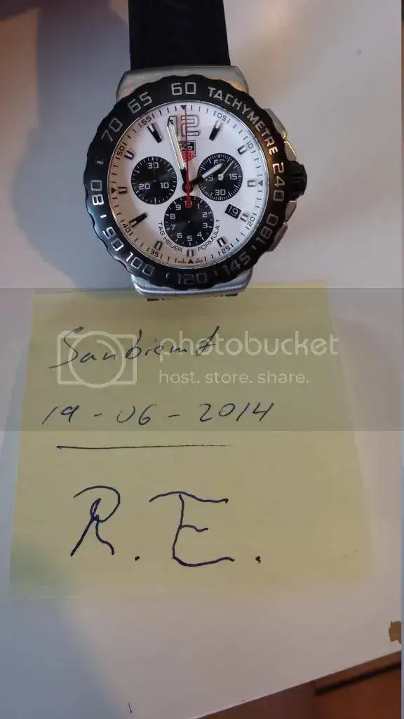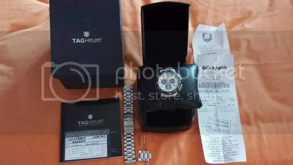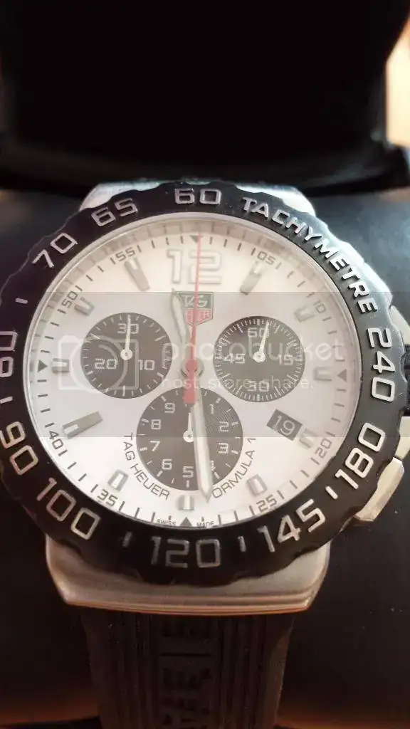 Esa vez saco a la venta este deportivo Tag Heuer F1 Crhonograph con dial en blanco y sub esferas en negro, el reloj esta en muy buenas condiciones dado que el uso que se le da es exporádico dado que rota con el resto de mis relojes. El reloj es de Enero del 2013, con todavia 6 meses de Garantia.