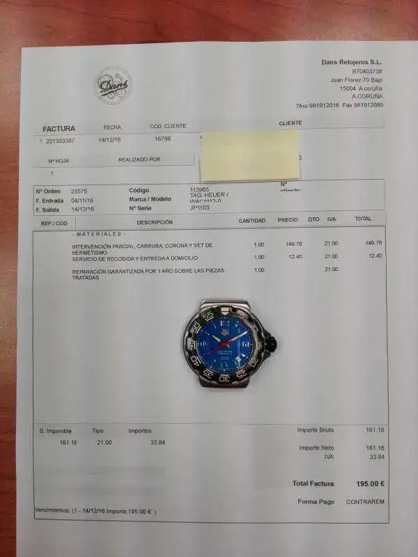 Como podéis comprobar se envió a Dans Relojeros para dejarlo como nuevo (adjunto factura de 195 euros).
