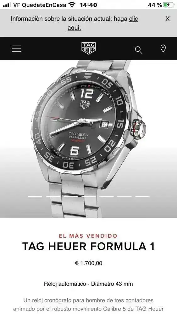Buenas a tod@s, espero que esteis bien, saco a la venta este TAG HEUER FORMULA 1 CALIBRE 5 con a penas unos meses completo y con garantía oficial vigente, ha tenido un uso de oficina ( tiene pelos en el cierre )que no se pueden evitar...pero aun conserva algunos plásticos , reloj de 43mm automático calibre 5 ,zafiro etc...muchas gracias a tod@s pero en especial a R.E. por este espacio