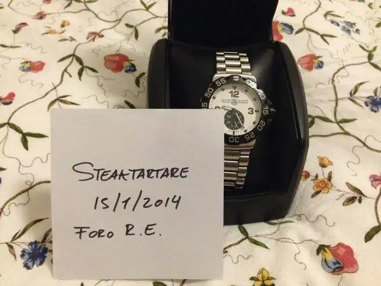 Se trata de un viejo conocido del foro, un Tag Heuer Grande date, con esfera blanca (impresionante porque brilla toda ella en la oscuridad), y armis. Se trata del set completo: cajas, garantía (fechada en CO oficial español a finales de Agosto 2013, por lo que tiene unos 19 meses por delante), eslabones sobrantes, plásticos, etc... Fué comprado por mi y he sido su único dueño.