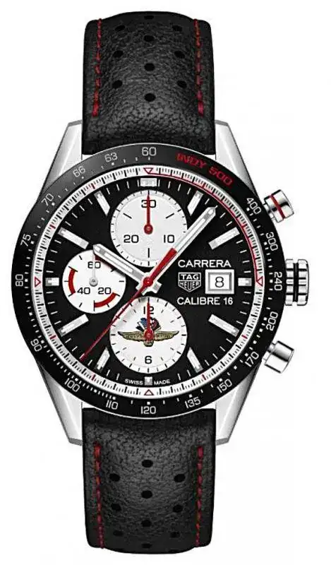 Disponible con una correa de piel de becerro negra perforada con costuras y forro rojo, el reloj Carrera de 41 mm de diámetro está claramente vinculado a la carrera Indy 500. El logo de la Indy 500 se encuentra en la subesfera a las 6 y la inscripción "Indy 500" está grabada en rojo en el bisel de cerámica. La esfera negra de este deportivo cronógrafo se completa con contadores blancos, una ventanilla de fecha a las 3 y las inscripciones "Carrera" y "Calibre 16" en blanco.