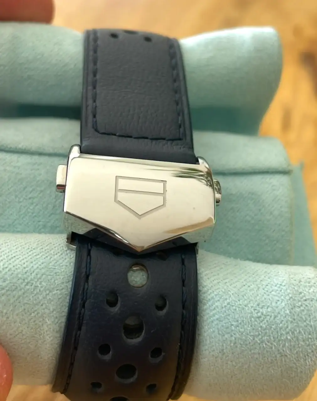 Brazalete: piel de becerro azul perforada con cierre deployante.