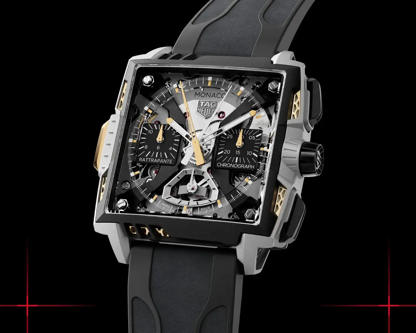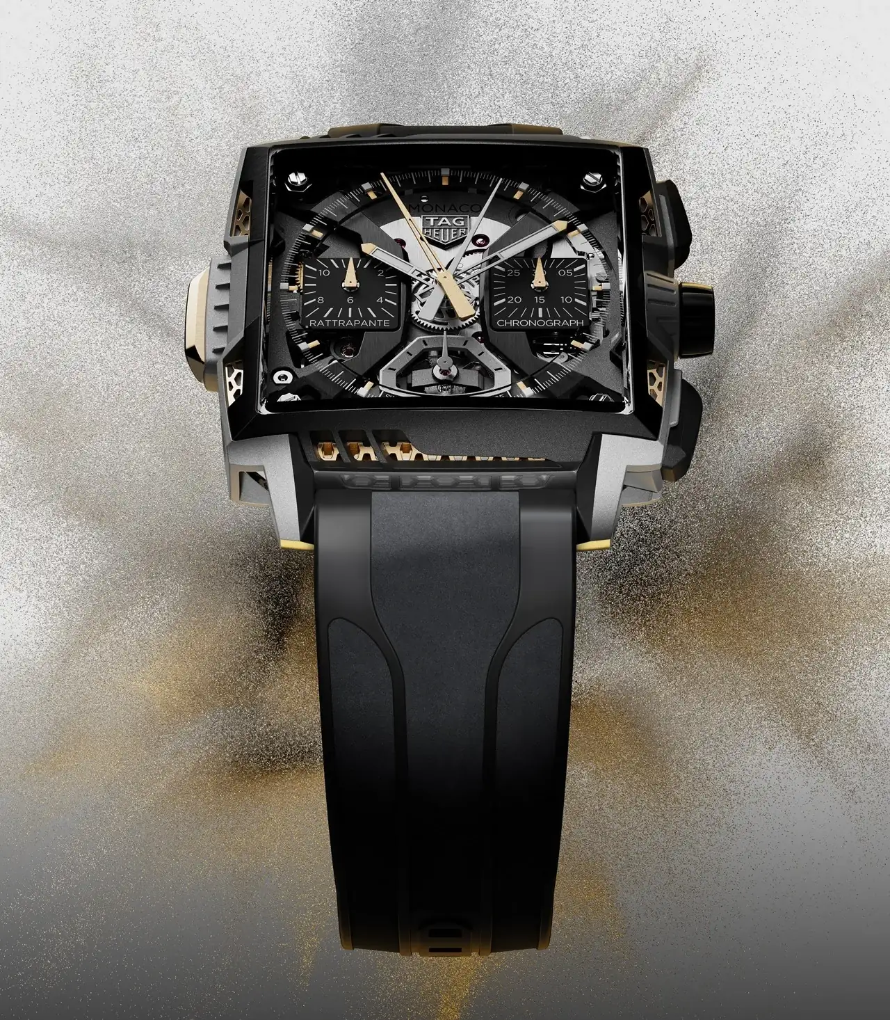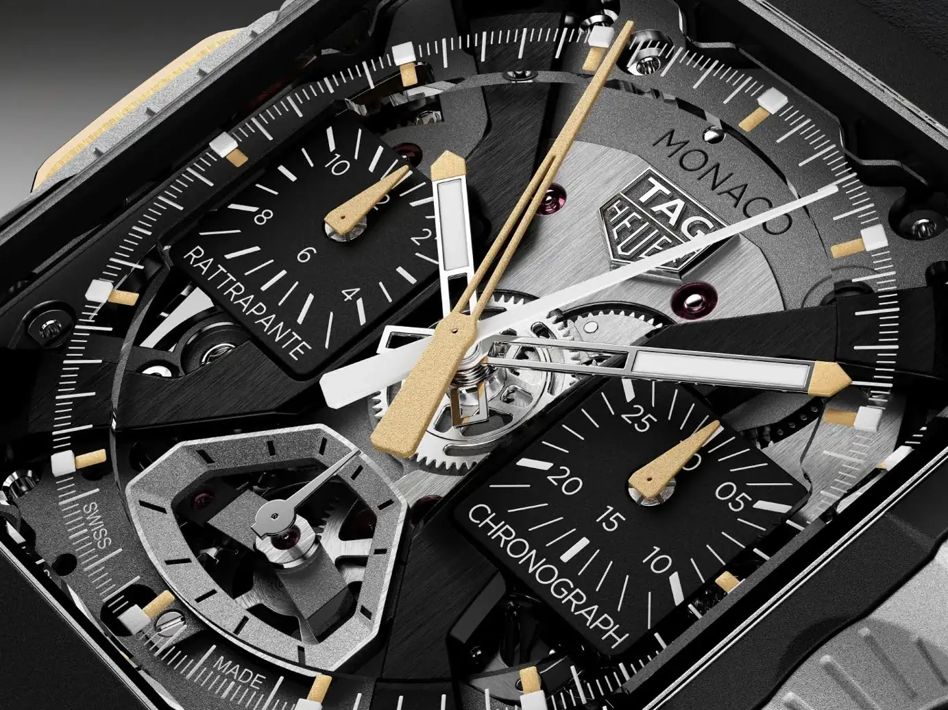 El aspecto high-tech del reloj se completa con una esfera de zafiro translúcida que permite ver el funcionamiento del movimiento desde la parte de la esfera, pulsadores de cronógrafo y una corona cónica de titanio de grado 5 recubierta de DLC negro. Las agujas de los contadores son doradas, las agujas de horas y minutos tienen punta dorada, los índices horarios son dorados y los cristales de zafiro delantero y trasero están sujetos por cuatro tornillos que quedan visibles. El pulsador del ratrapante, situado a las 9, está fabricado en oro amarillo macizo de 2N y es un guiño a la corona original situada a la izquierda del TAG Heuer Monaco. El Monaco Split-Seconds Chronograph Air 1 se presenta con una correa deportiva de caucho negro con inserciones de alcántara y una hebilla de titanio de grado 5 recubierta de DLC negro.