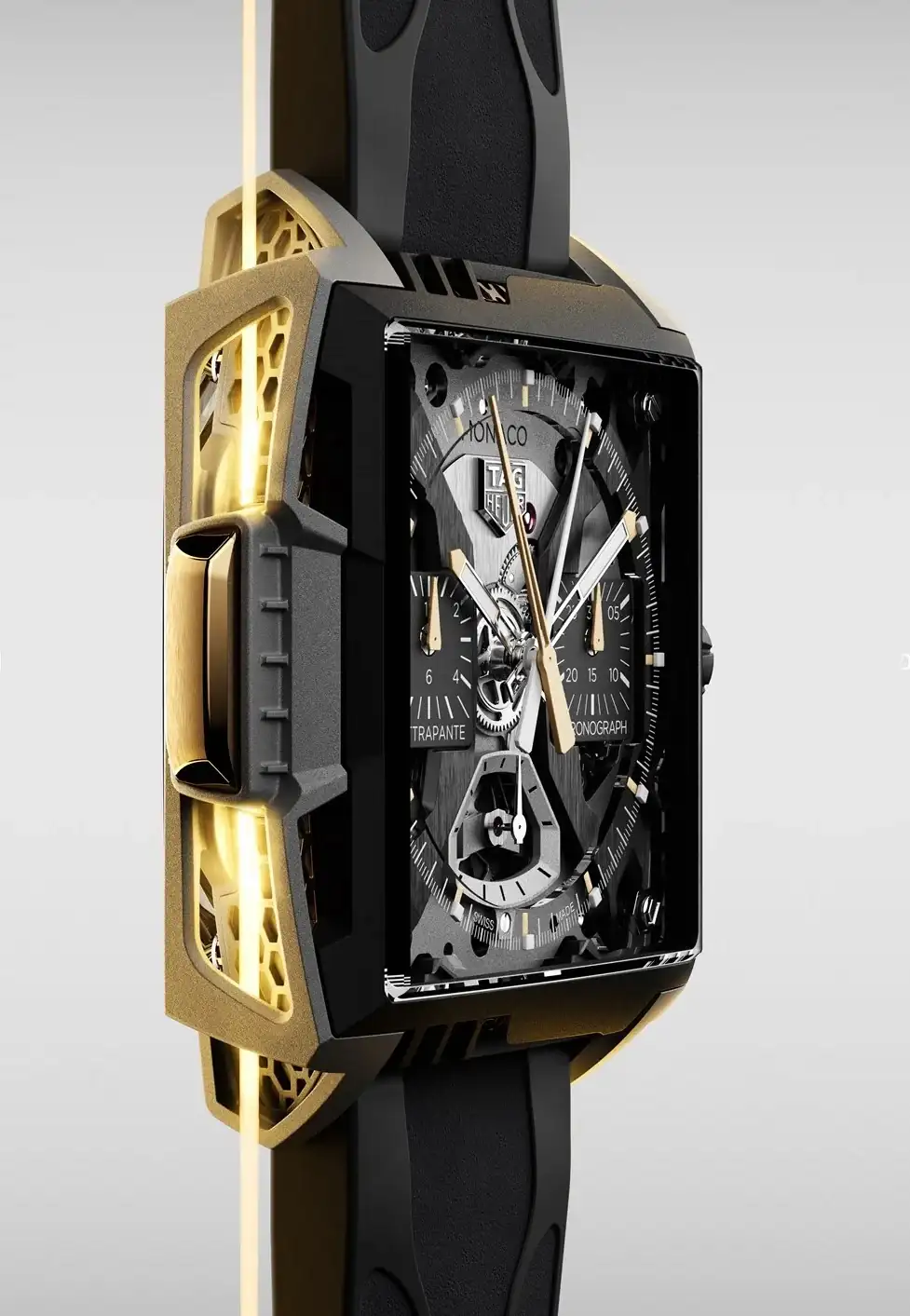 Su caja ultraligera de titanio de grado 5 se ha fabricado mediante una técnica de fabricación de última generación denominada fusión selectiva por láser (SLM), un proceso de fabricación aditiva que se utiliza frecuentemente en los sectores aeroespacial, médico y automovilístico para crear componentes de precisión con geometrías complejas. El resultado es que el TAG Heuer Monaco Split-Seconds Chronograph Air 1 parece ahuecado, como si se hubiera diseñado pensando en la velocidad y el flujo de aire, y da la sensación de que podría haber sido concebido en un túnel de viento. Pesa solo 85 gramos, incluyendo varios componentes de oro macizo.