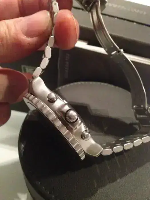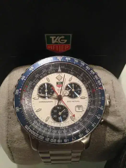 voy a sacar a sacar venta este tag heuer pilot, en buen estado, con algunos arañazos típicos del uso y paso del tiempo, el bisel esta un poco marcado justo en la parte de arriba, encima del numero 60.