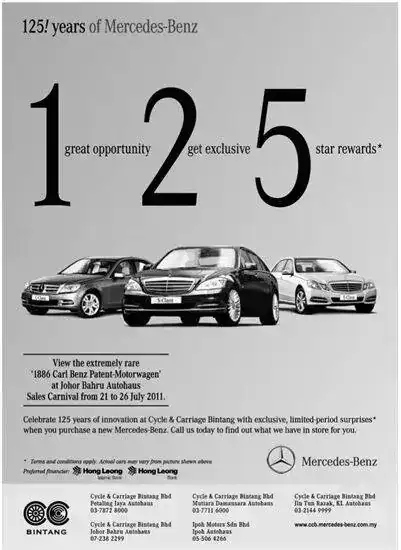 Vuelvo a poner el anuncio de arriba. Leemos en inglés "125 años de Mercedes-Benz".