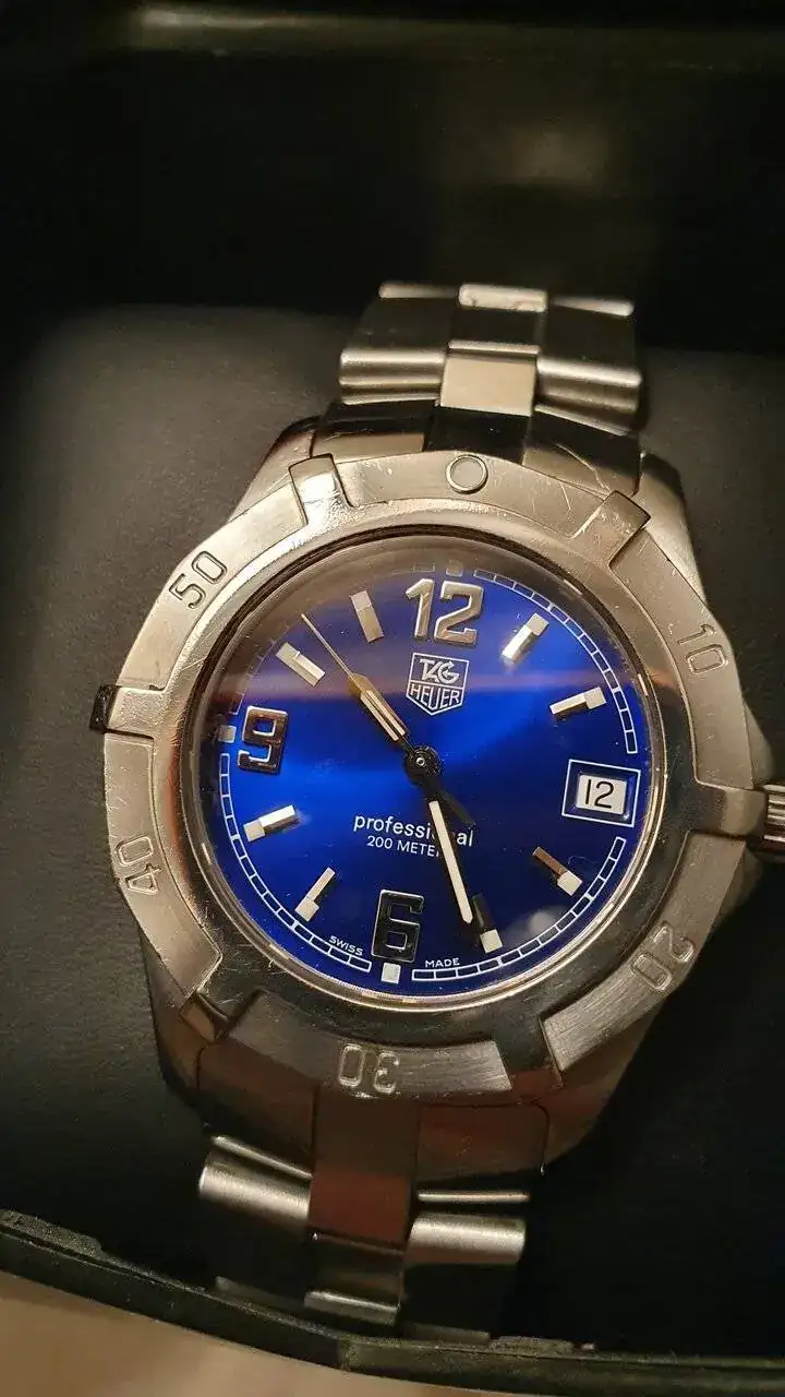 Continúo aligerando la caja de diales azules, por lo que ahora saco a la venta éste bonito Tag Heuer con maquinaria de cuarzo suízo y un tamaño de 38mm sin contar la corona, que lo hace muy versátil. Tiene las señales de uso que se pueden ver en las fotos, pero en muñeca no son tan perceptibles. En cualquier caso, creo que el ventajoso precio que le asigno lo compensa con creces.