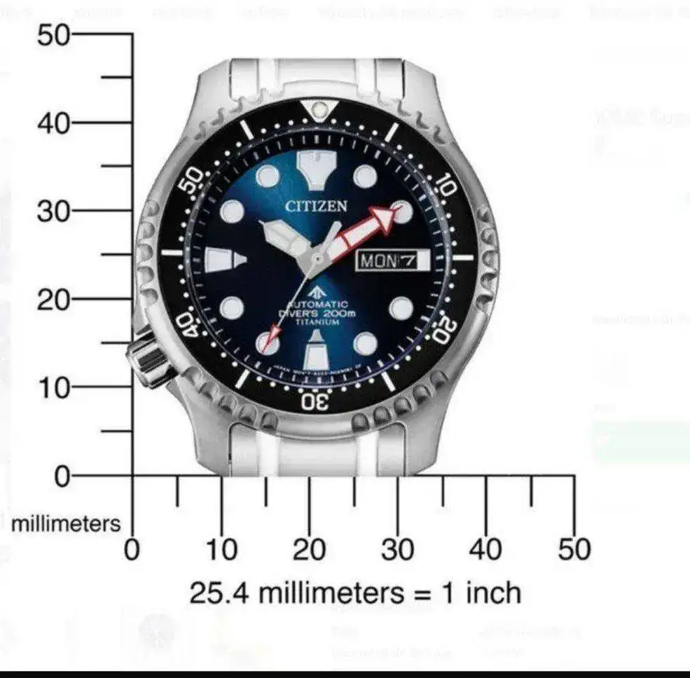 Este articulo viene a colación por que hace unos días compre un reloj de 42,5 mm (Citizen promaster titanium automatico modelo NY0100-50M), en las imágenes antes de la llegada del reloj no aprecie realmente el tamaño y aunque en foros lo anunciaron me deje llevar por mi impresión y fue un tremendo error, ya en la muñeca la sensación que tuve desde el primer momento es de llevar un reloj de máximo 40 mm y en pocos días deje de llevarlo pues mi percepción ya se había acostumbrado a relojes de mayor tamaño en lo relativo a relojes submarinos.