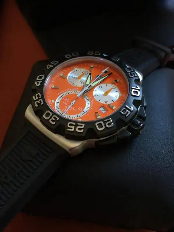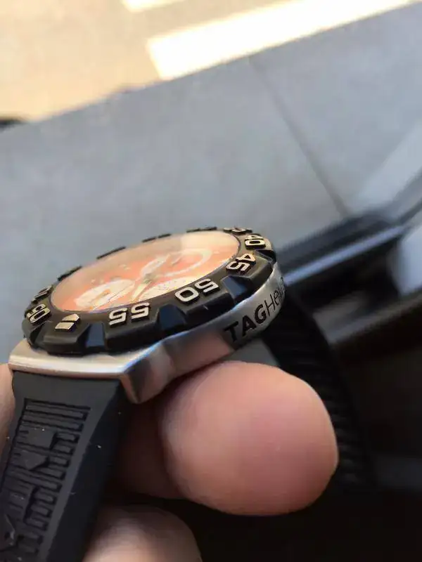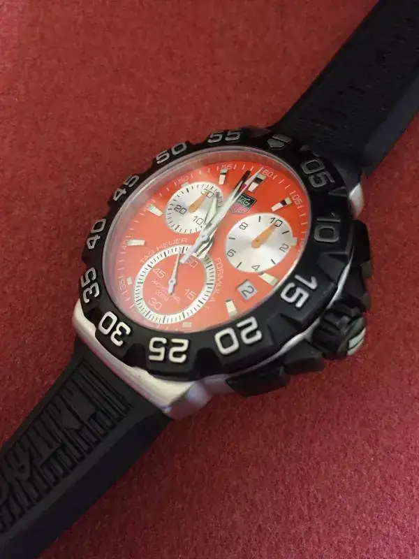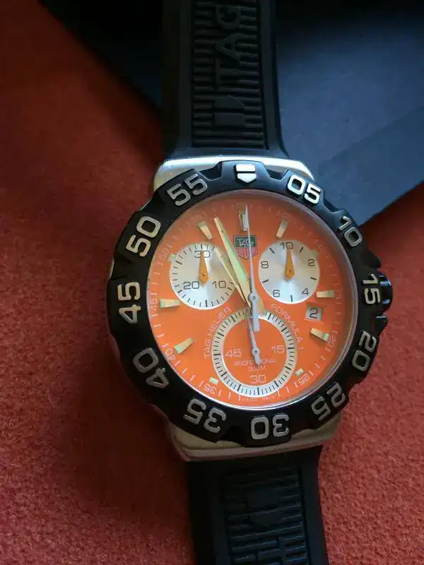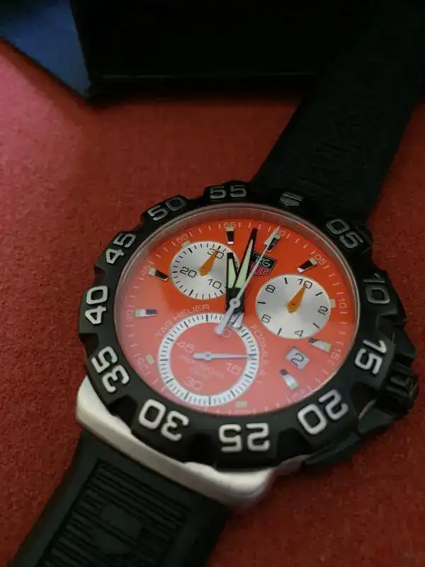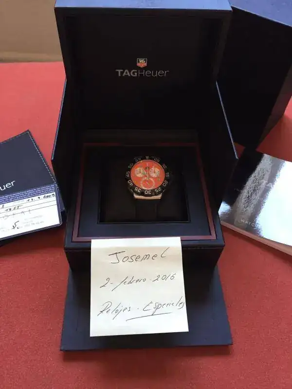Saco a la venta este precioso Tag F1, se trata de la versión crono que como sabéis está ya descatalogada y que a mi modo de ver con esta esfera es la versión más bonita que sacó Tag. Como podéis apreciar en las fotos su estado es muy bueno, tiene leves señales de un uso muy esporádico, la más destacada una en la parte exterior del bisel, a la altura del 50 y que podéis ver en la ultima foto. Se entrega con set completo de cajas y documentación. Su precio es de 650€ puesto en casa por correos certificado. Puedo aceptar únicamente como cambio o parte de pago un Apple Watch de 42.