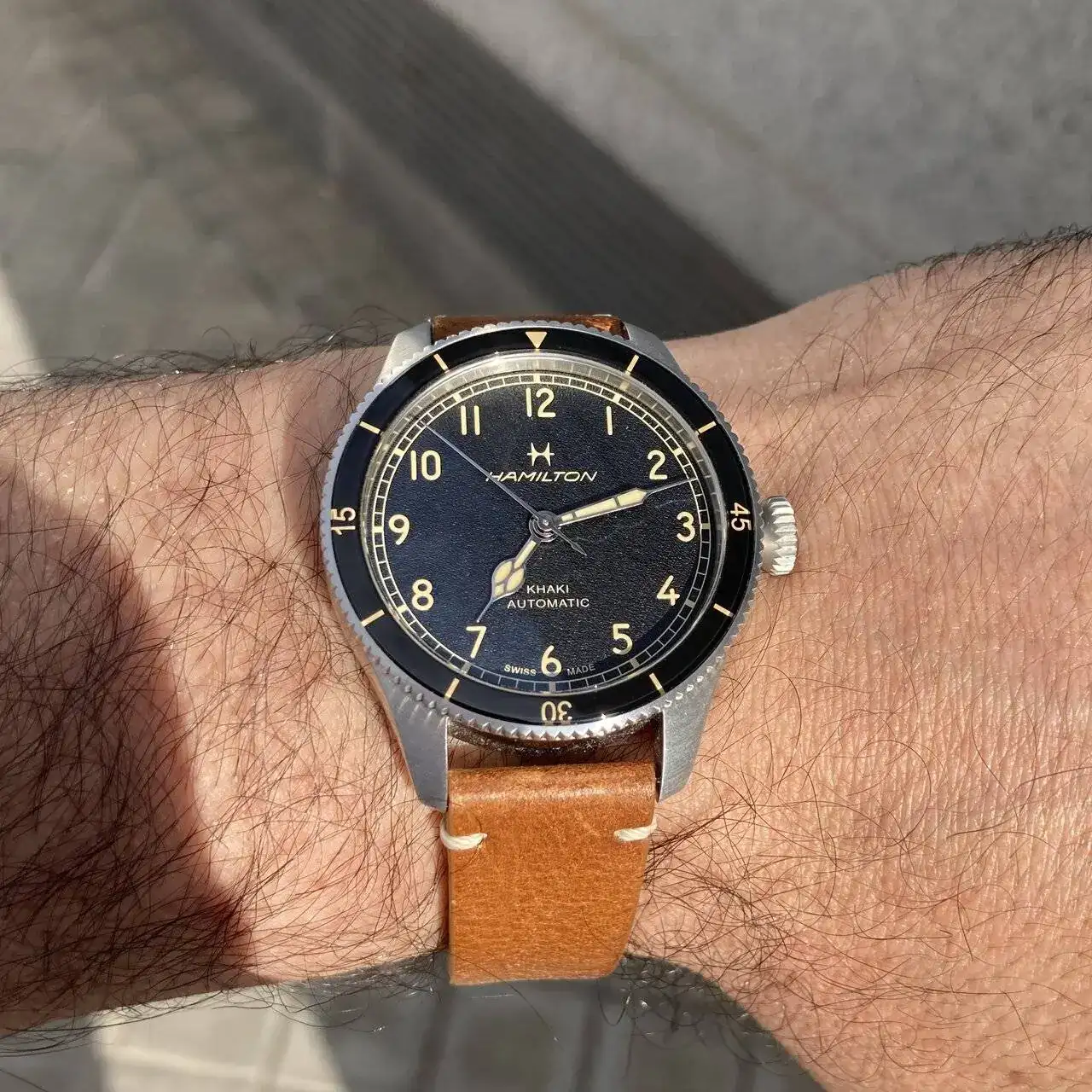 En su lugar me probé el nuevo Hamilton Expedition en 37mm, muy guapo la verdad. Y "descubrí" el Khaki Aviation Pilot Pioneer en 38 que es del mismo estilo que el Tissot. No sabia que estaba en tamaño pequeño! No me lo llegue a probar pero bufffff, muy muy guapo.
