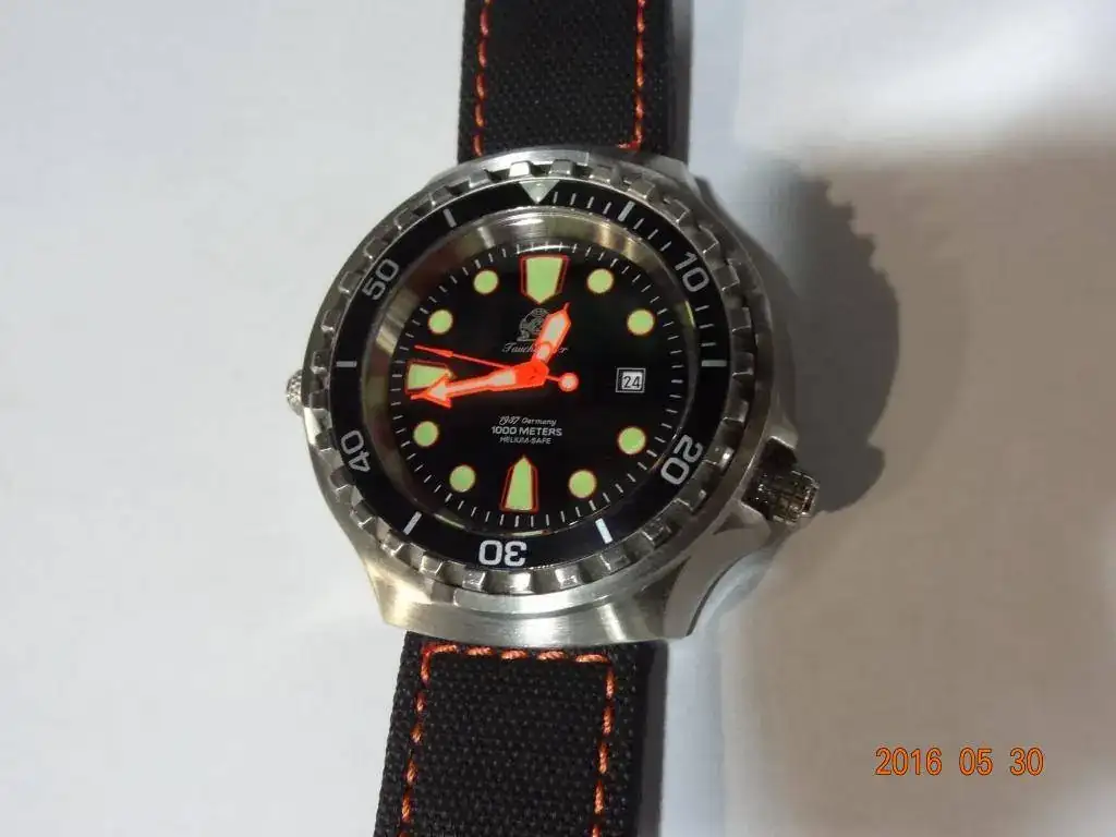 Hola compañeros, saco para venta esta bestia, comprado hace tan solo unos dias, a un excelente forero, pero que no es para mi. Se trata de un Tauchmeister 1000 metros de 52 mm., automatico miyota, valvula de helio roscada, bisel unidireccional de 120 clics y cristal de zafiro. Lo clasificaria en un estado practicamente impoluto ya que le aprecio pelos en la tapa trasera, caja y cristal, a las fotos me remito. Vamos con la ficha, datos sacados de su web, ya que asi me llego del compañero, sin caja ni papeles, y asi es como lo mando, eso si, super bien embalado.